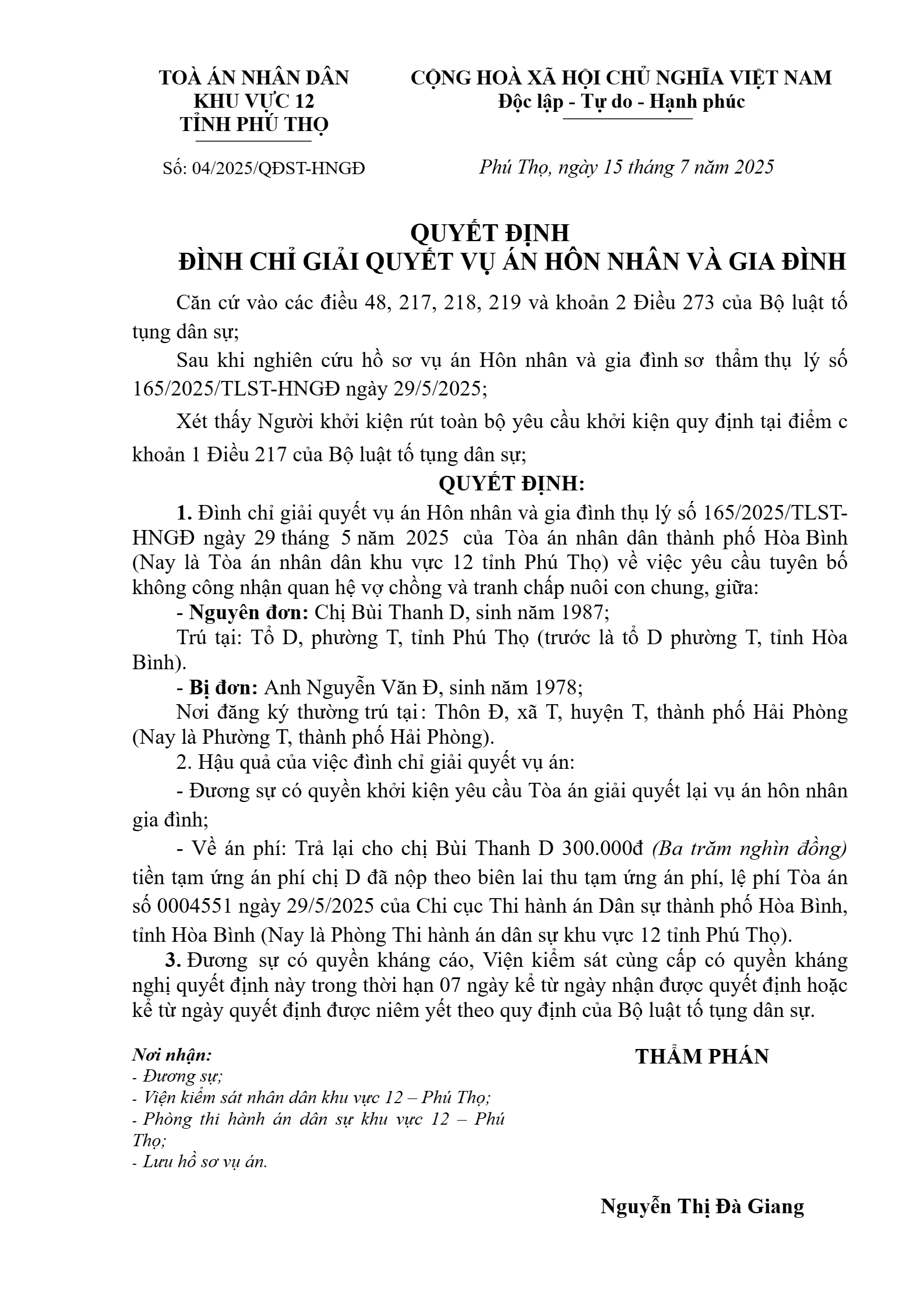 Quyết định số 04/2025/QĐST-HNGĐ ngày 15/07/2025 của Tòa án nhân dân khu vực 12 - Phú Thọ, tỉnh Phú Thọ về tranh chấp về nuôi con, chia tài sản của nam, nữ chung sống với nhau như vợ chồng mà không đăng ký kết hôn hoặc hủy kết hôn trái pháp luật