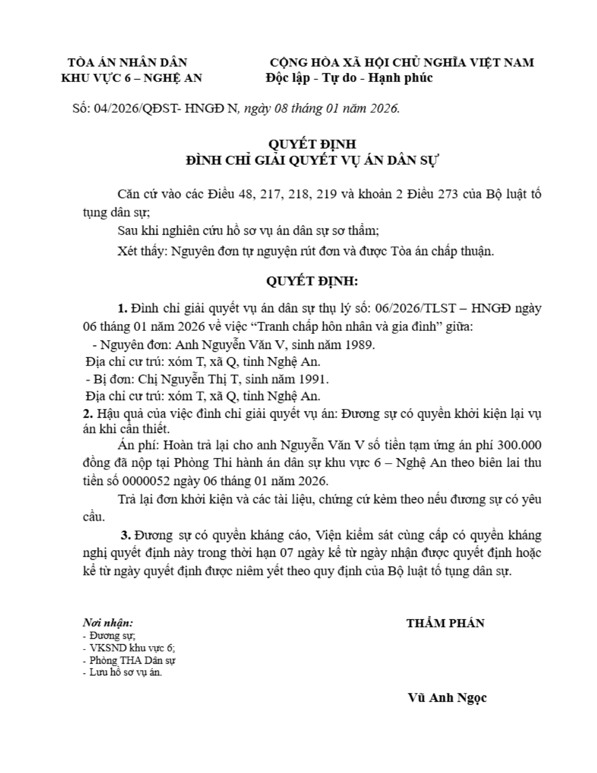 Quyết định số 04/2026 ngày 07/01/2026 của Tòa án nhân dân khu vực 6 - Nghệ An, tỉnh Nghệ An về vụ án ly hôn về mâu thuẫn gia đình