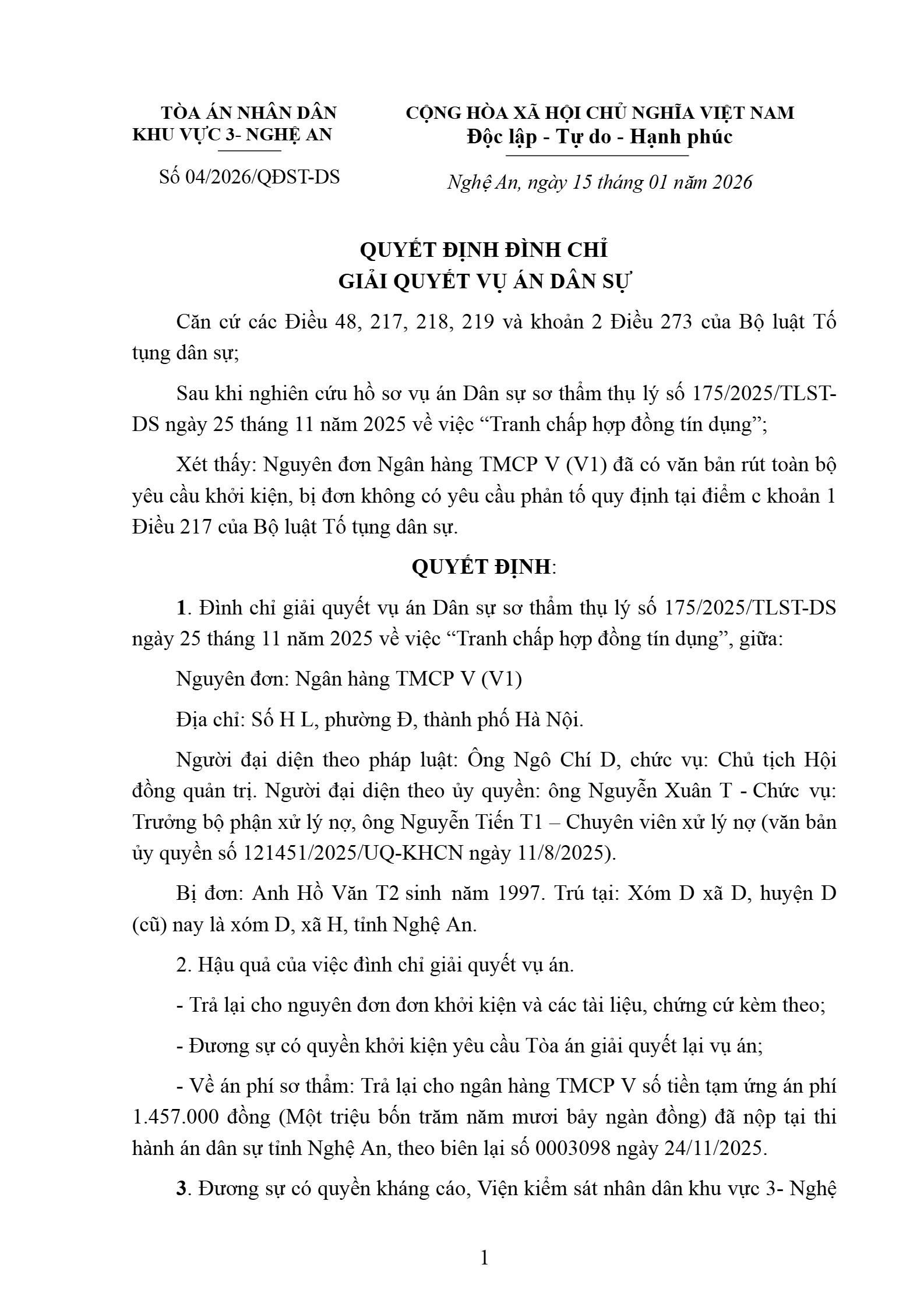 Quyết định số 04/2026/QĐST-DS ngày 15/01/2026 của Tòa án nhân dân khu vực 3 - Nghệ An, tỉnh Nghệ An về tranh chấp hợp đồng tín dụng
