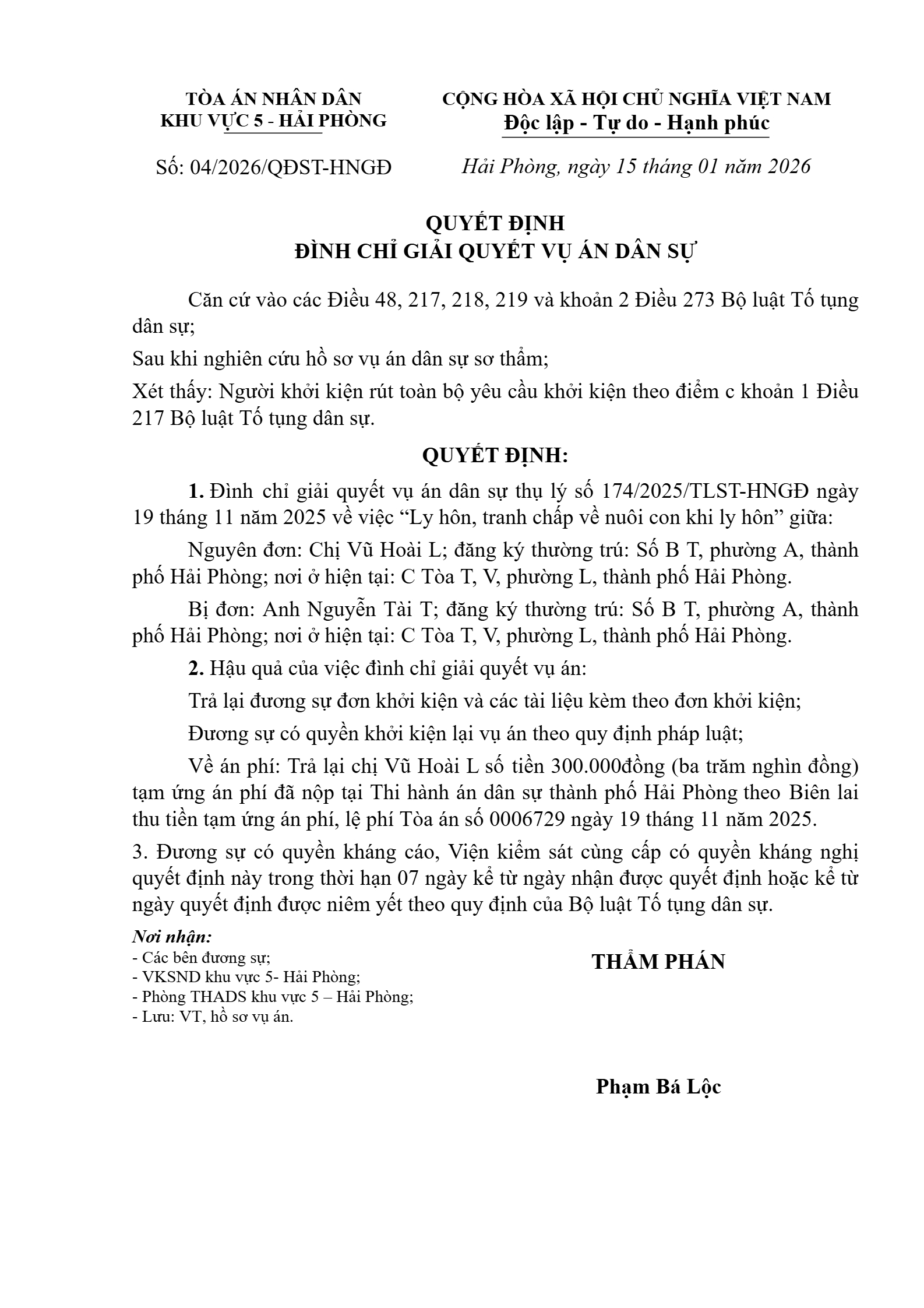 Quyết định số 04/2026/QĐST-HNGĐ ngày 15/01/2026 của Tòa án nhân dân khu vực 5 - Hải Phòng, TP. Hải Phòng về vụ án ly hôn về mâu thuẫn gia đình