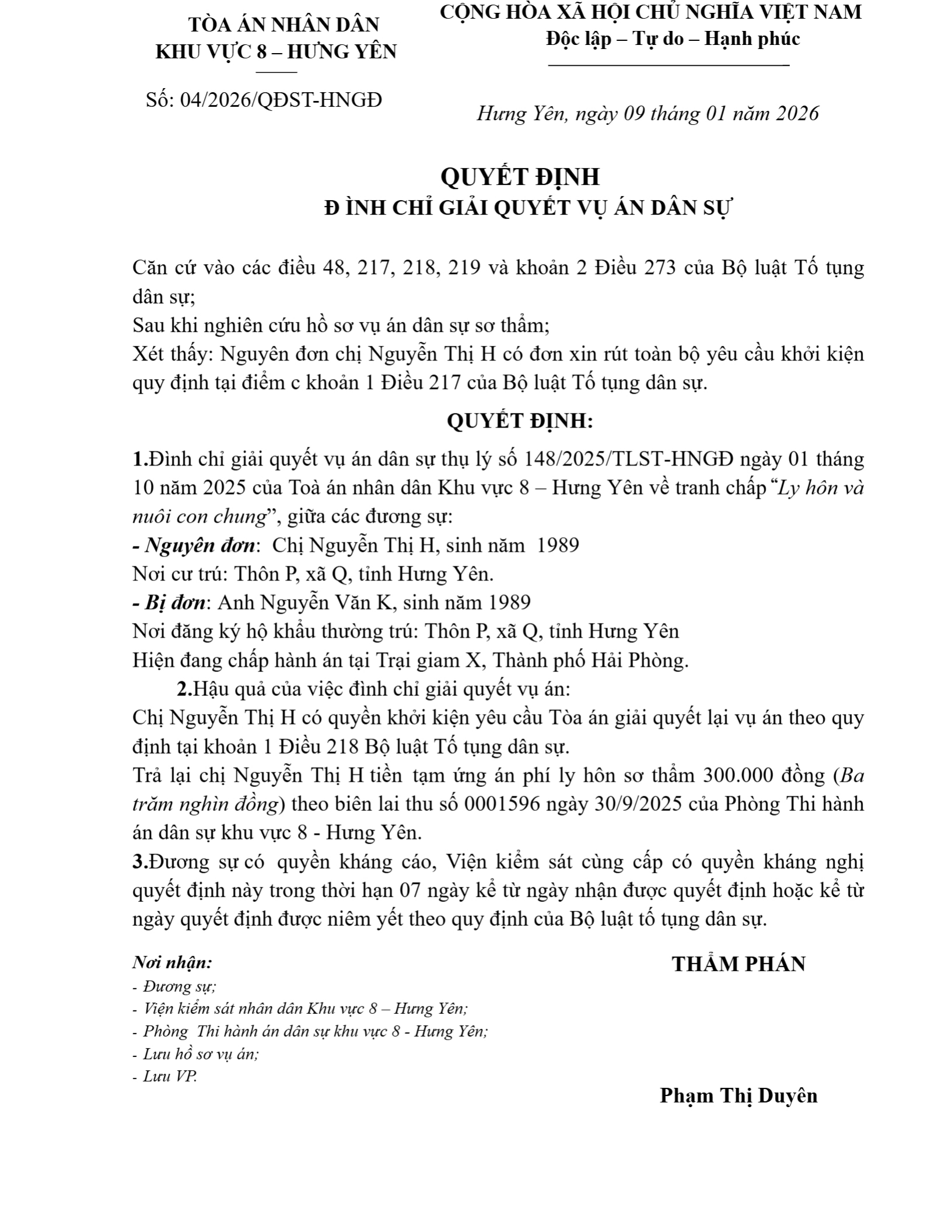 | Thông tin về vụ/việc: | Quyết định đình chỉ giải quyết vụ án dân sự giữa chị Nguyễn Thị H và anh Phạm Văn K |