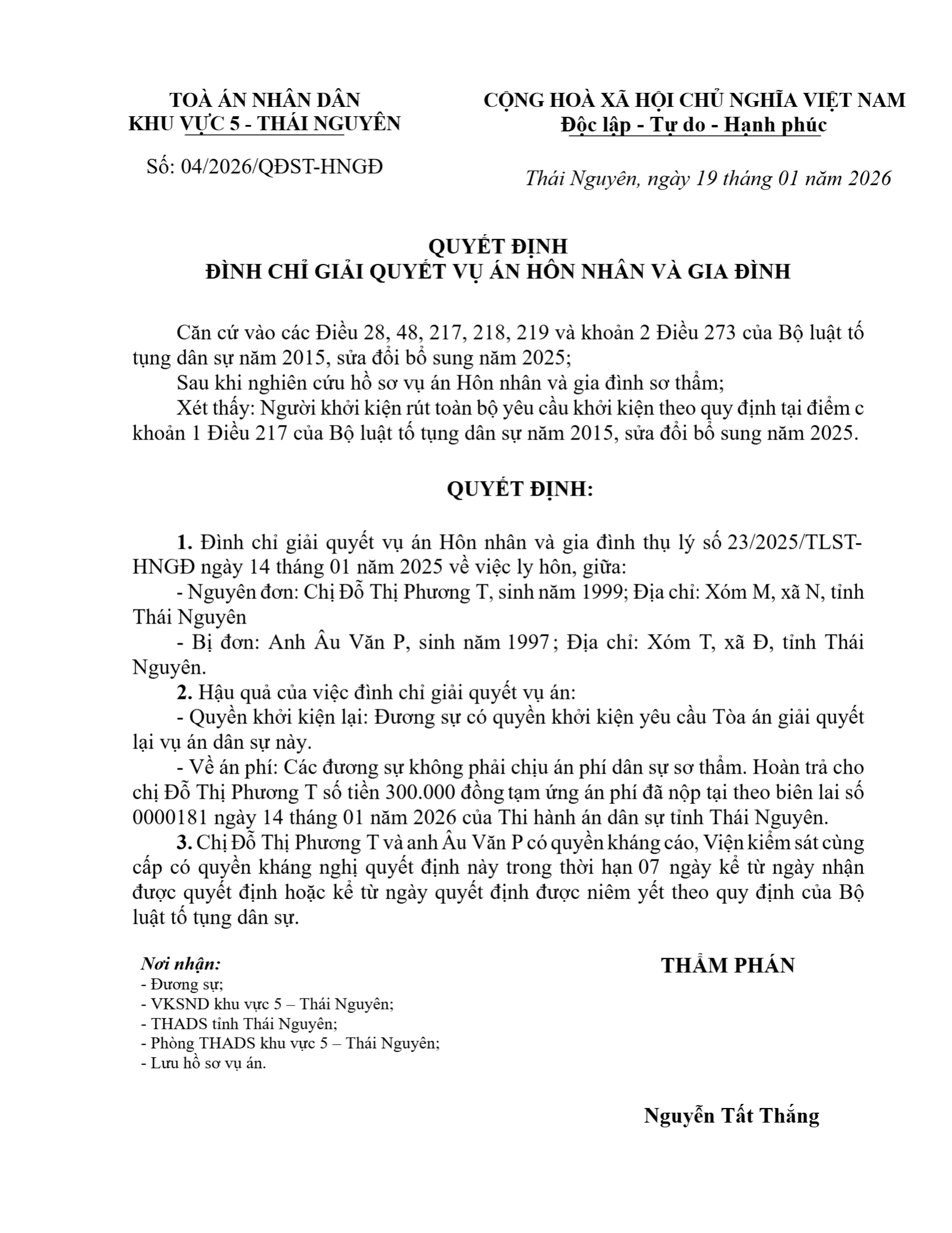 Quyết định số 04/2026/QĐST-HNGĐ ngày 19/01/2026 của Tòa án nhân dân khu vực 5 - Thái Nguyên, tỉnh Thái Nguyên về vụ án ly hôn về mâu thuẫn gia đình