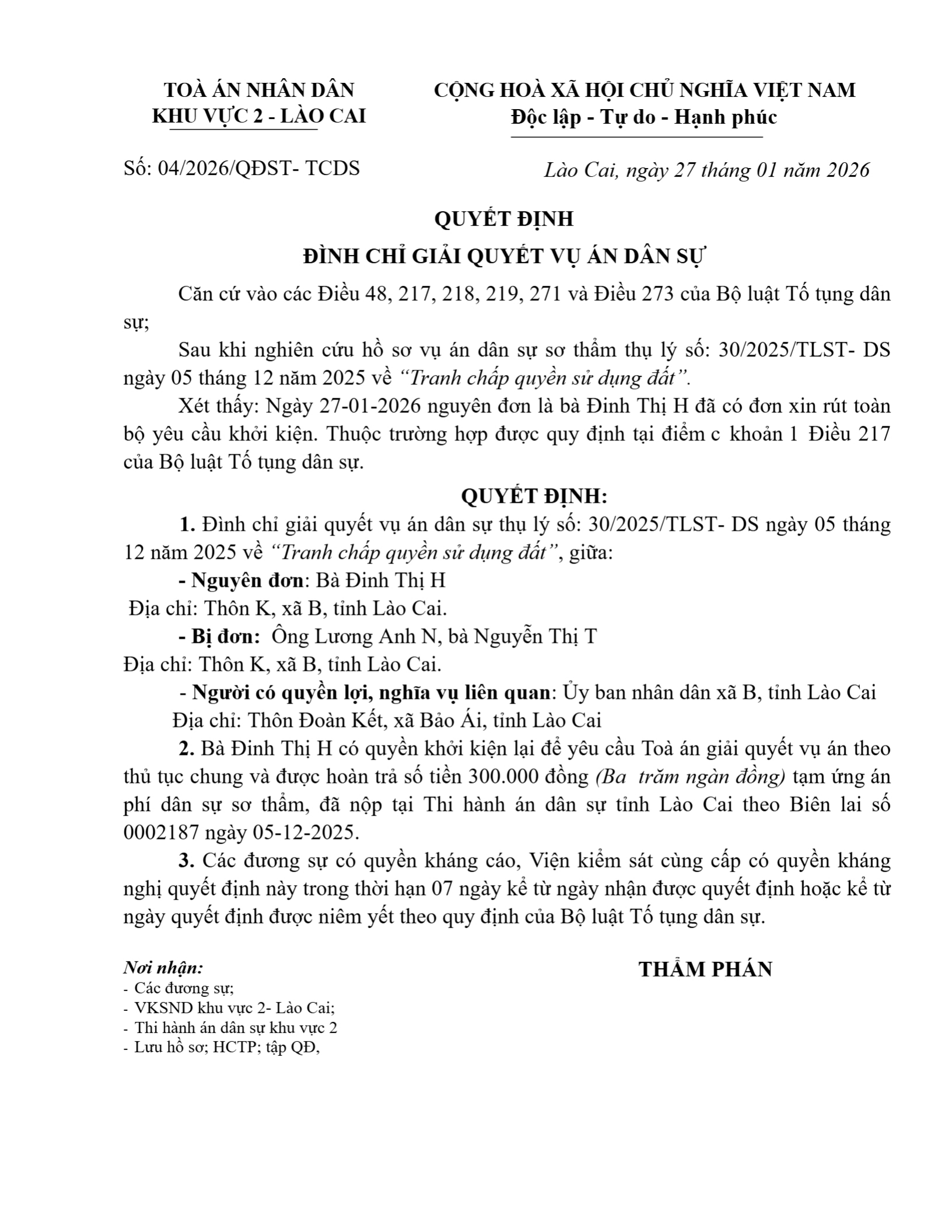 Quyết định số 04/2026/QĐST-TCDS ngày 27/01/2026 của Tòa án nhân dân khu vực 2 - Lào Cai, tỉnh Lào Cai về tranh chấp quyền sử dụng đất