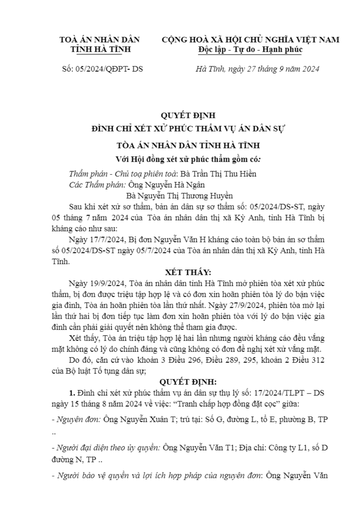 Quyết định số 05/2024/QĐPT-DS ngày 27/09/2024 của TAND tỉnh Hà Tĩnh về tranh chấp hợp đồng đặt cọc