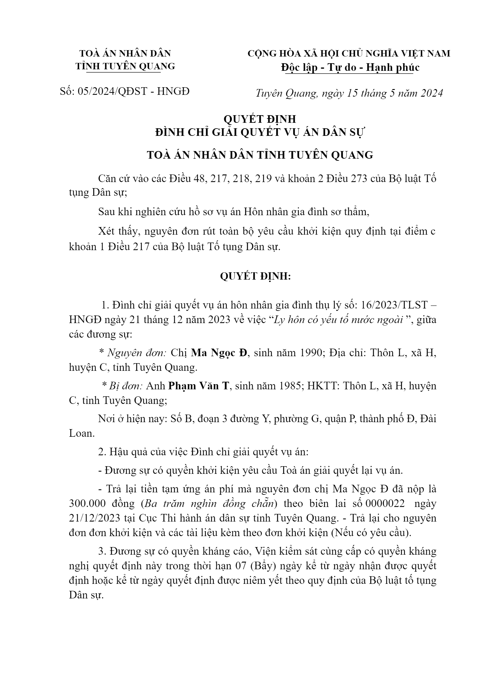 | Số hiệu: | 05/2024/QĐST-HNGĐ |
