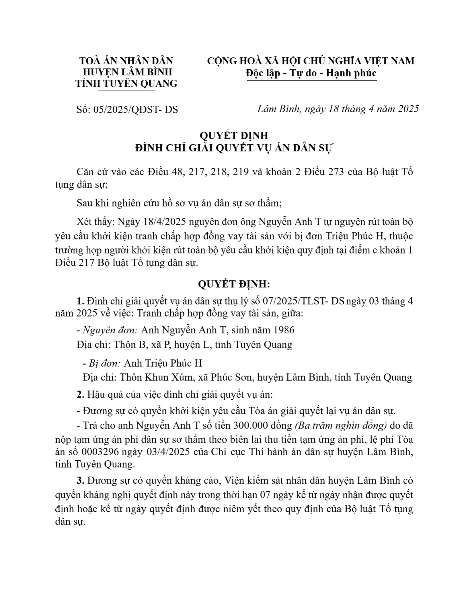 Quyết định số 05/2025/QĐST-DS ngày 18/04/2025 của TAND huyện Lâm Bình, tỉnh Tuyên Quang về tranh chấp hợp đồng vay tài sản