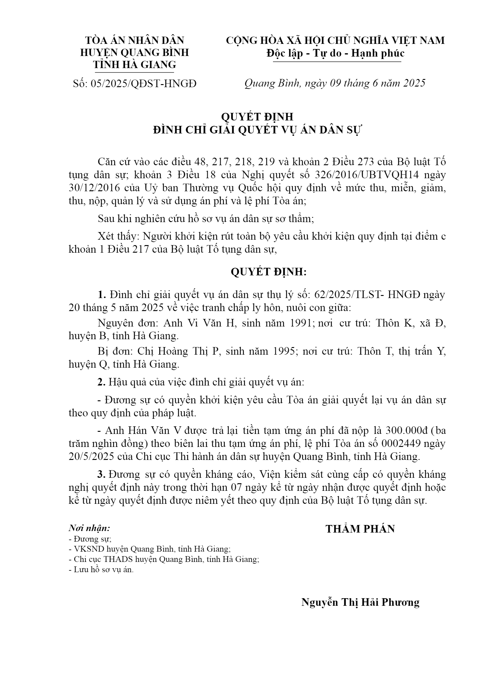 Quyết định số 05/2025/QĐST-HNGĐ ngày 09/06/2025 của TAND huyện Quang Bình, tỉnh Hà Giang về vụ án ly hôn về mâu thuẫn gia đình