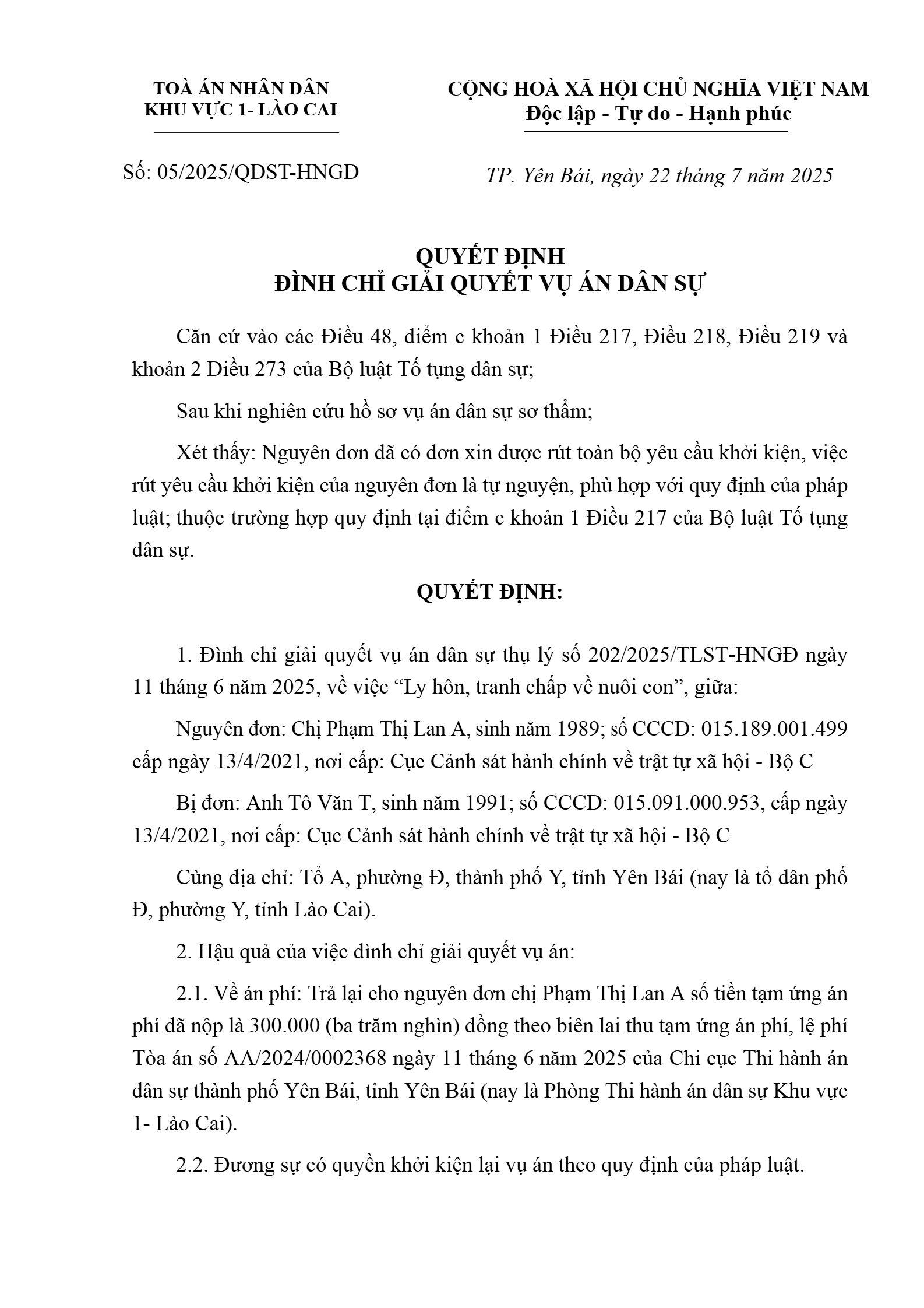 Quyết định số 05/2025/QĐST-HNGĐ ngày 22/07/2025 của Tòa án nhân dân khu vực 1 - Lào Cai, tỉnh Lào Cai về vụ án ly hôn về mâu thuẫn gia đình