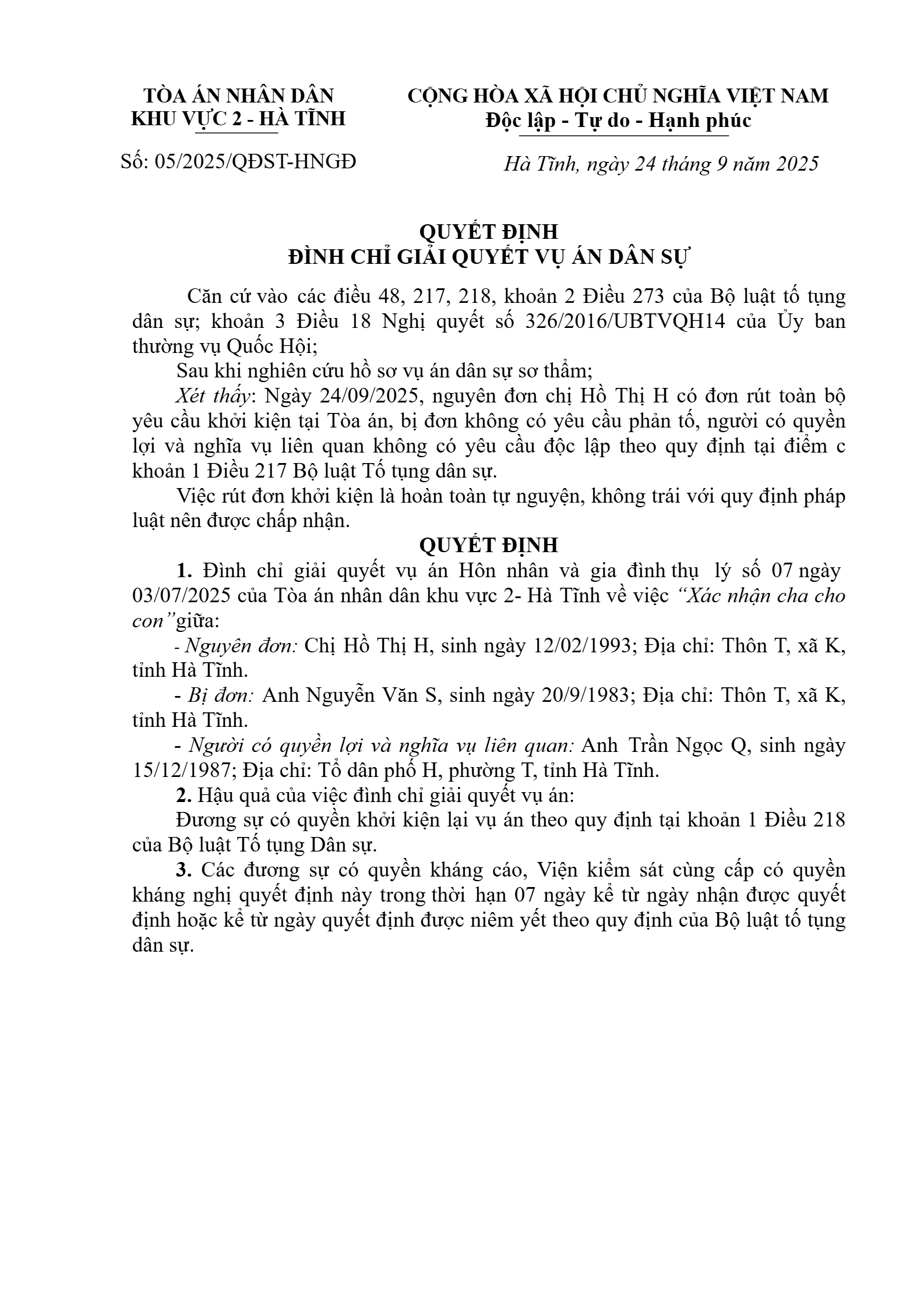 Quyết định số 05/2025/QĐST-HNGĐ ngày 24/09/2025 của Tòa án nhân dân khu vực 2 - Hà Tĩnh, tỉnh Hà Tĩnh về tranh chấp về xác định cha, mẹ cho con hoặc con cho cha mẹ