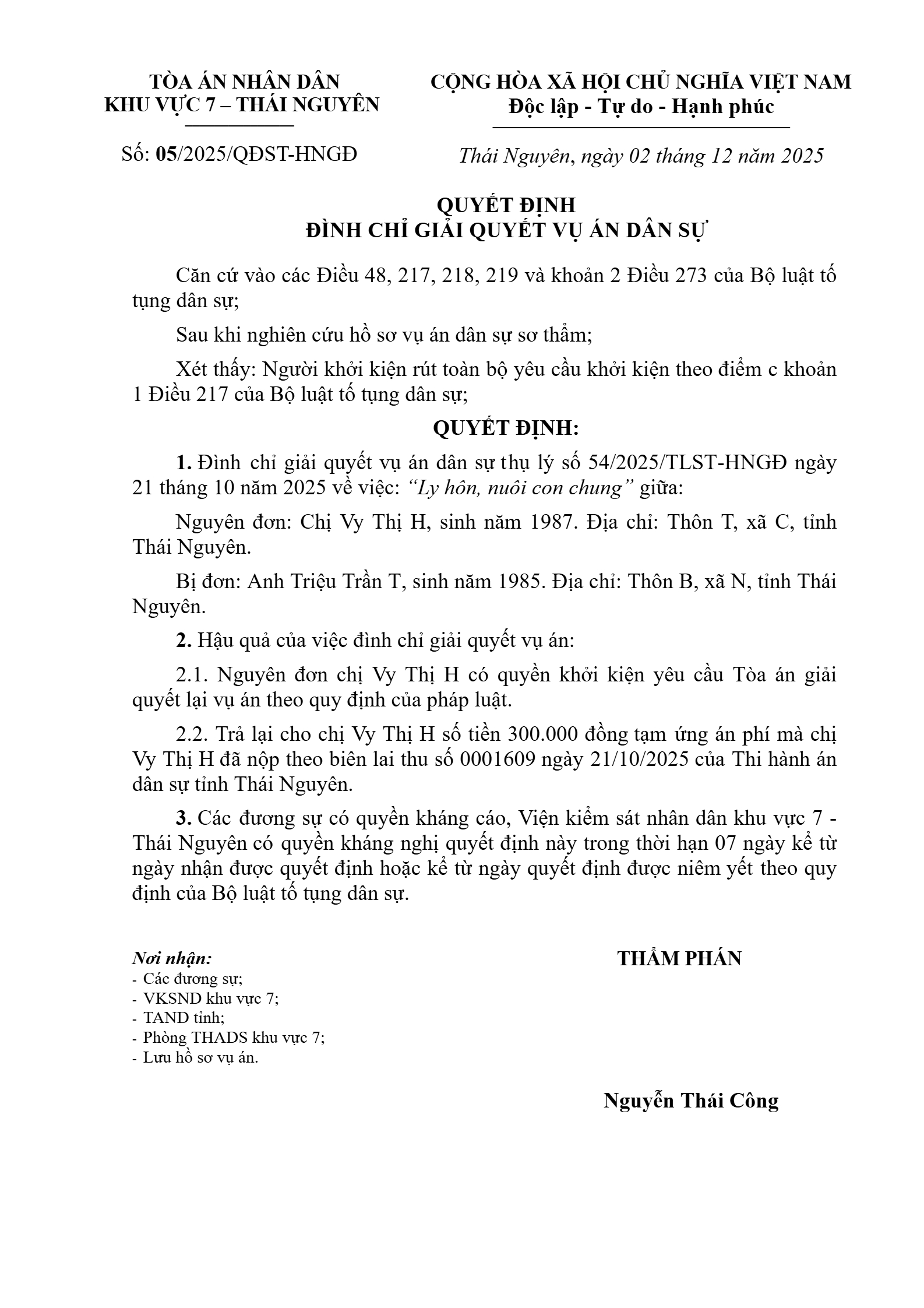 | Tòa án xét xử: | Tòa án nhân dân khu vực 7 - Thái Nguyên, tỉnh Thái Nguyên |