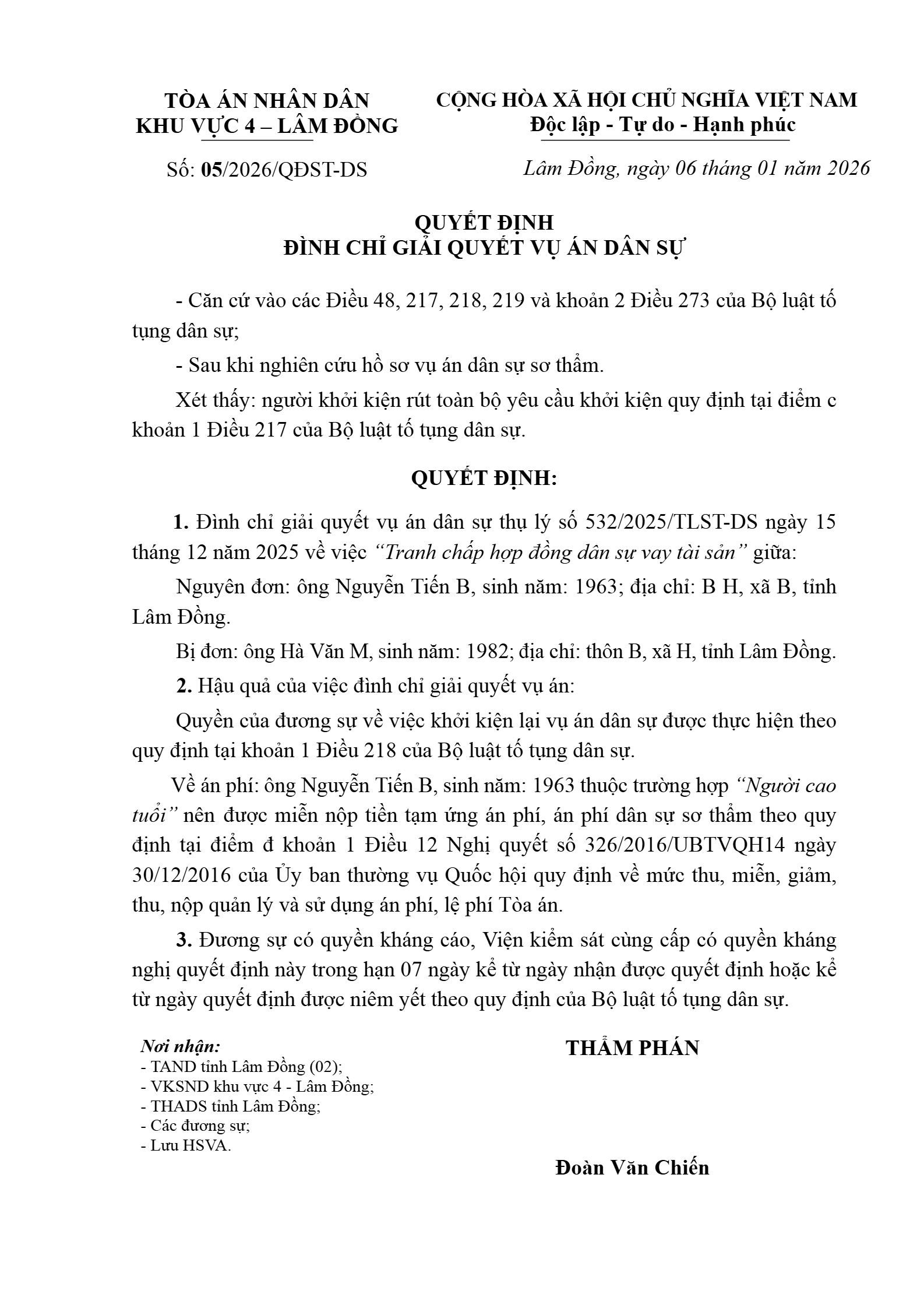 Quyết định số 05/2026/QĐST-DS ngày 06/01/2026 của Tòa án nhân dân khu vực 4 - Lâm Đồng, tỉnh Lâm Đồng về tranh chấp hợp đồng vay tài sản