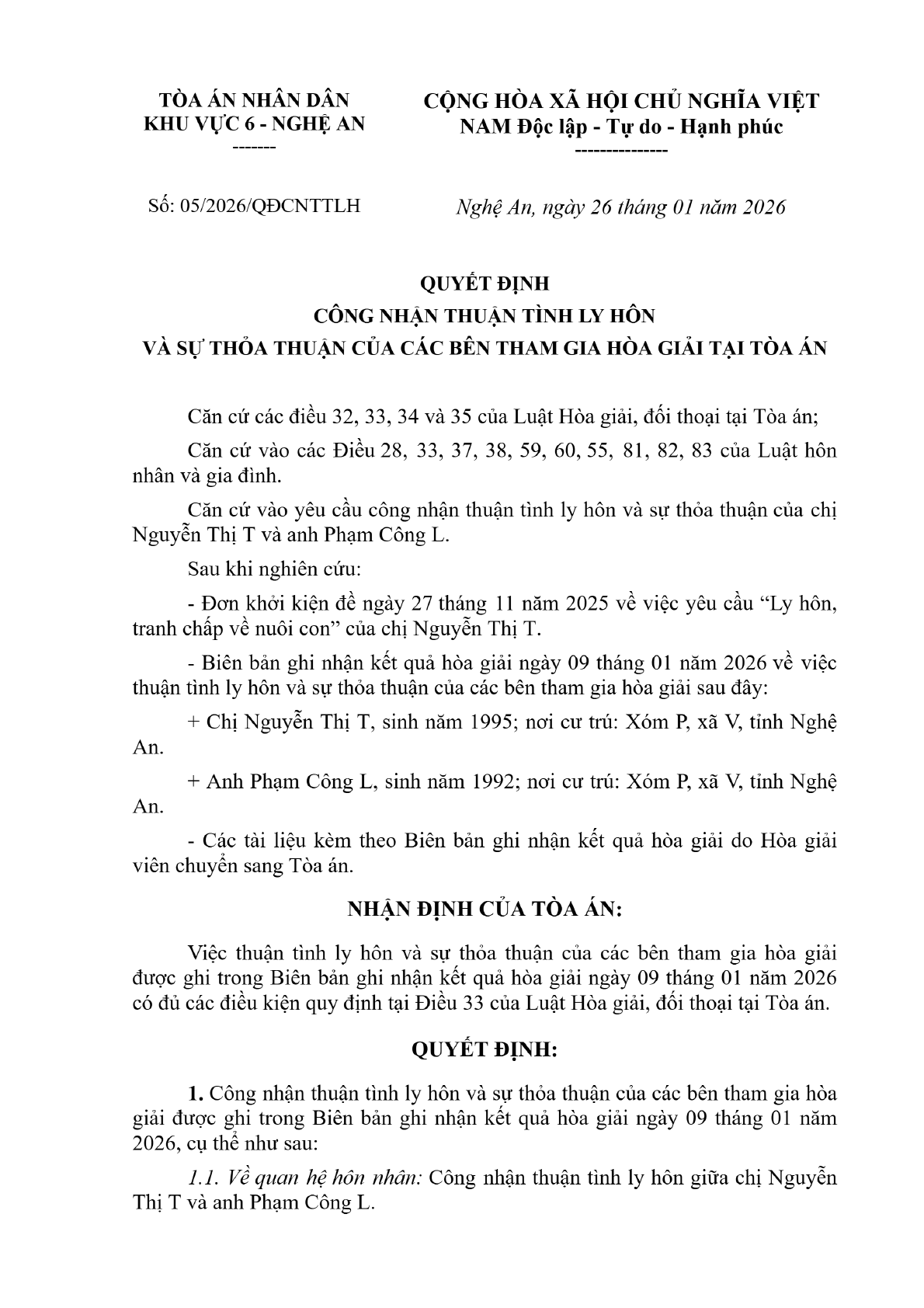 Quyết định số 05/2026/QĐST-HNGĐ ngày 26/01/2026 của Tòa án nhân dân khu vực 6 - Nghệ An, tỉnh Nghệ An về vụ án ly hôn về mâu thuẫn gia đình