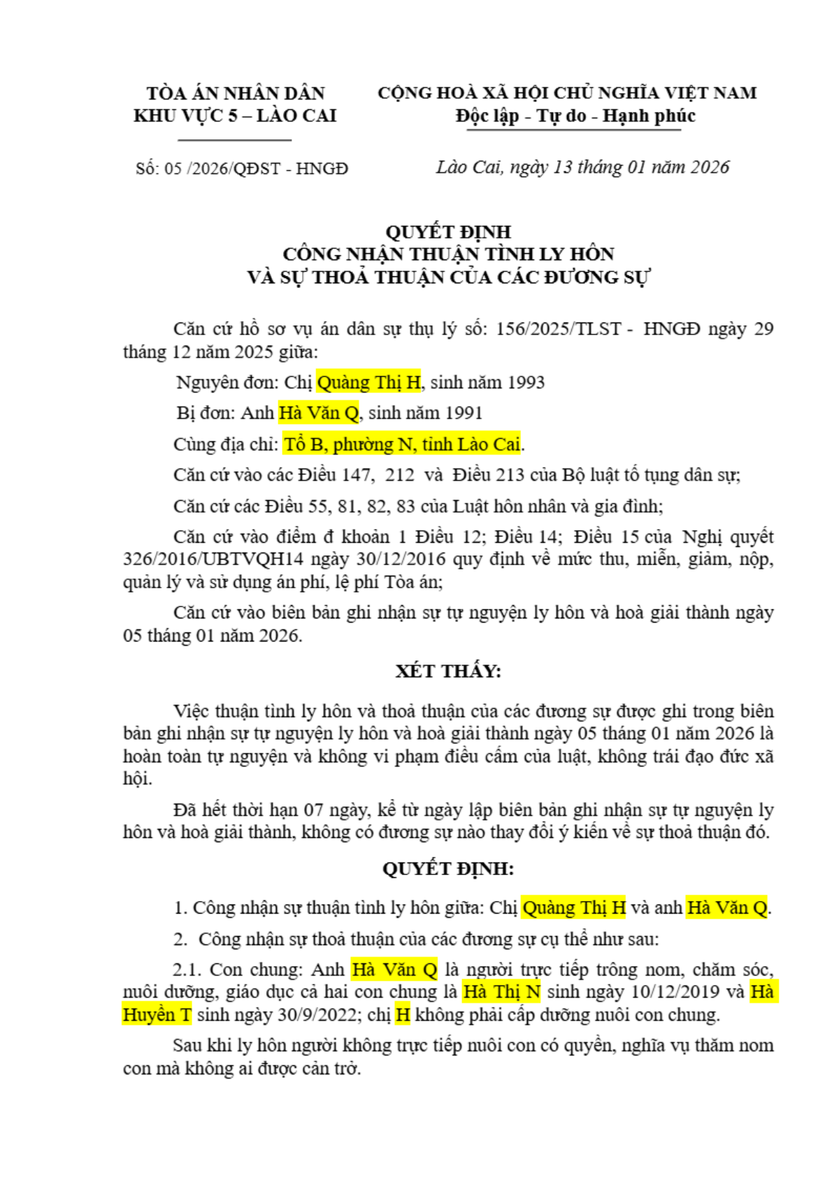 Quyết định số 05/2026/QĐST-HNGĐ ngày 13/01/2026 của Tòa án nhân dân khu vực 5 - Lào Cai, tỉnh Lào Cai về vụ án ly hôn về mâu thuẫn gia đình
