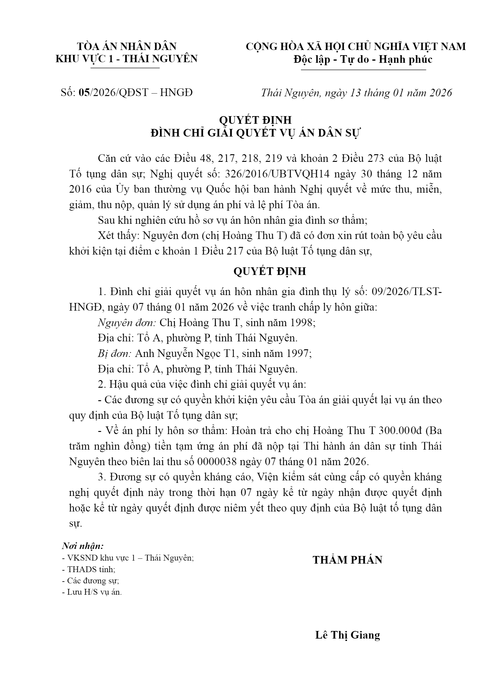 Quyết định số 05/2026/QĐST-HNGĐ ngày 13/01/2026 của Tòa án nhân dân khu vực 1 - Thái Nguyên, tỉnh Thái Nguyên về vụ án ly hôn về mâu thuẫn gia đình