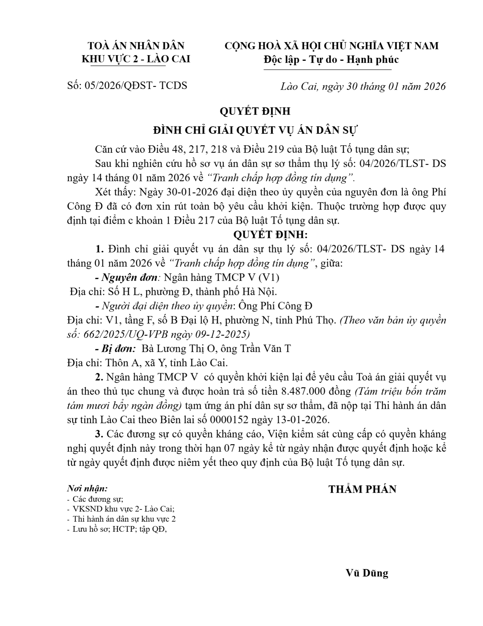 Quyết định số 05/2026/QĐST-TCDS ngày 30/01/2026 của Tòa án nhân dân khu vực 2 - Lào Cai, tỉnh Lào Cai về tranh chấp hợp đồng tín dụng