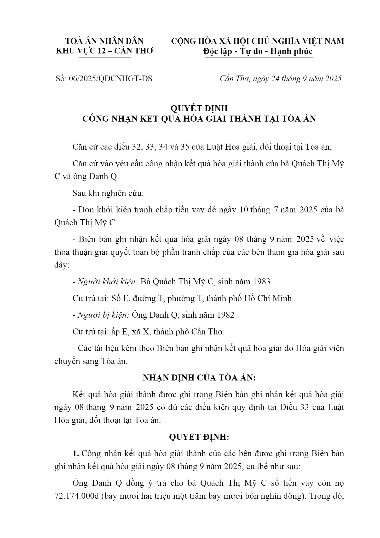 Quyết định số 06/2025/QĐCNHGT-DS ngày 24/09/2025 của Tòa án nhân dân khu vực 12 - Cần Thơ, TP. Cần Thơ về tranh chấp hợp đồng vay tài sản