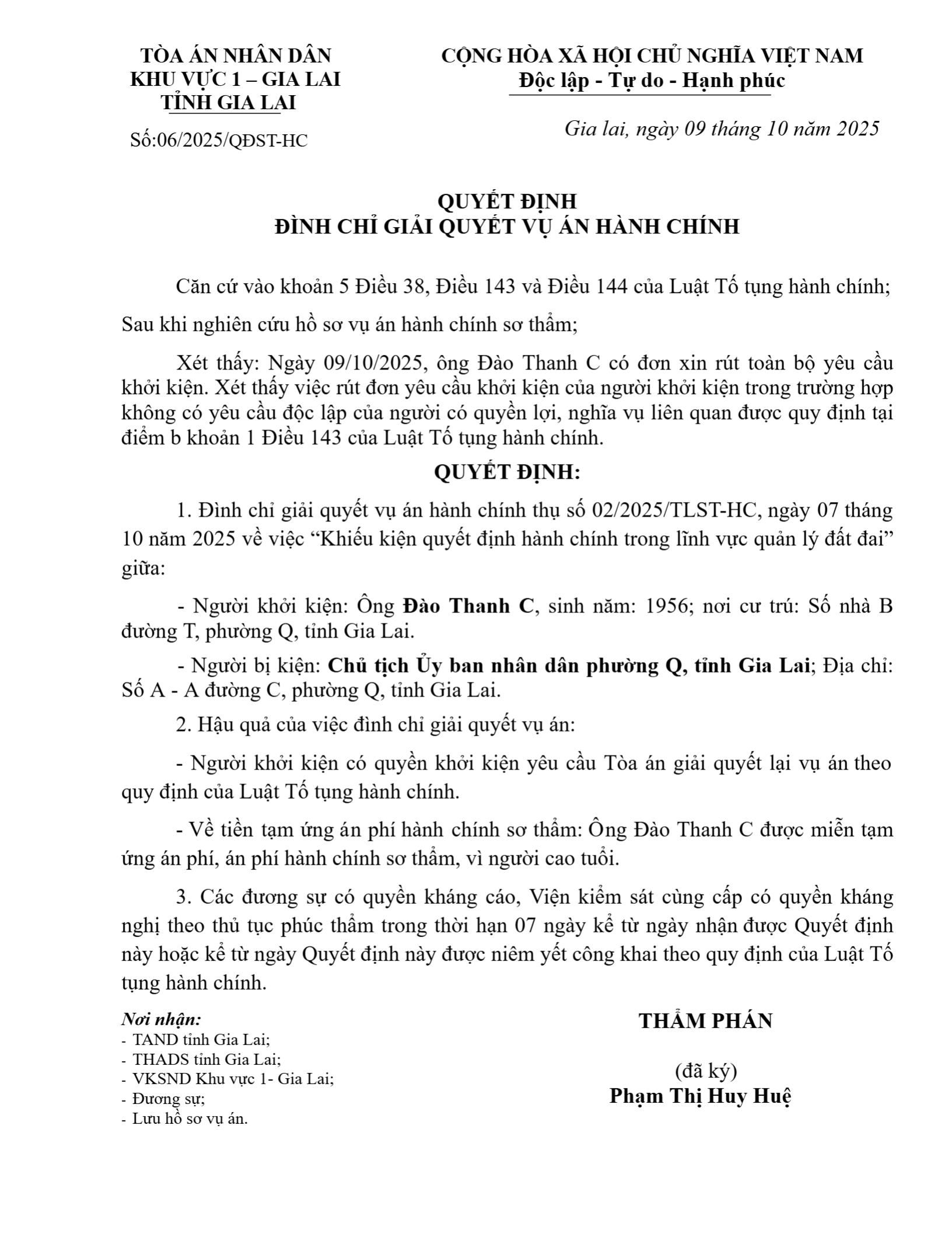 Quyết định số 06/2025/QĐST-HC ngày 09/10/2025 của Tòa án nhân dân khu vực 1 - Gia Lai, tỉnh Gia Lai