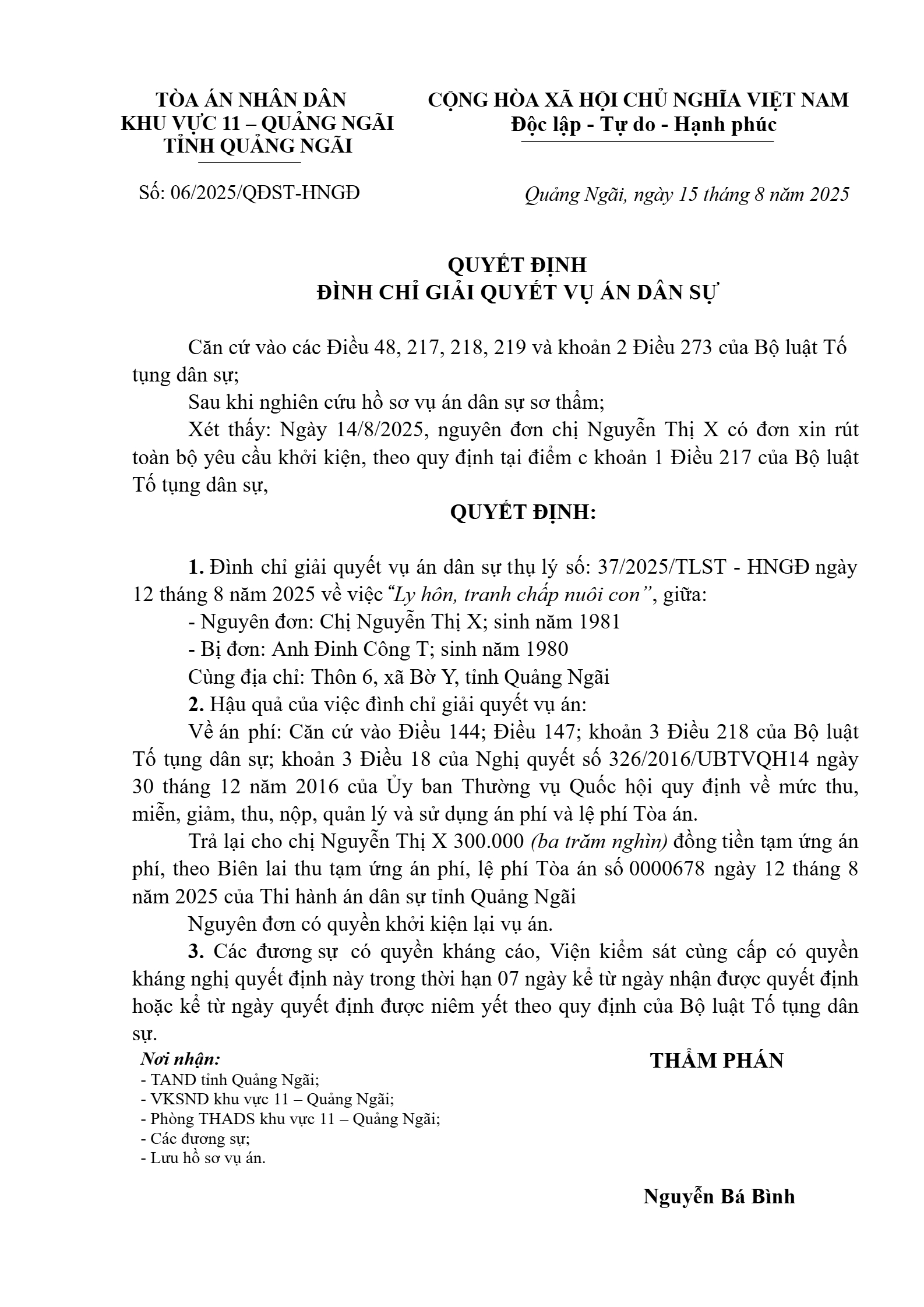 Quyết định số 06/2025/QĐST-HNGĐ ngày 15/08/2025 của Tòa án nhân dân khu vực 11 - Quảng Ngãi, tỉnh Quảng Ngãi về vụ án ly hôn về mâu thuẫn gia đình