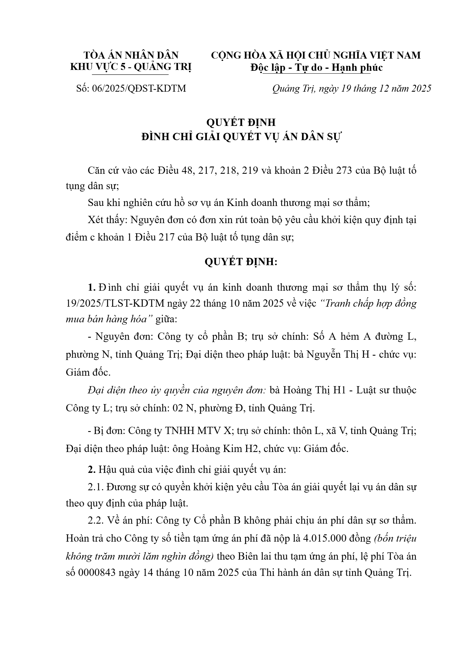 Quyết định số 06/2025/QĐST-KDTM ngày 19/12/2025 của Tòa án nhân dân khu vực 5 - Quảng Trị, tỉnh Quảng Trị về tranh chấp về mua bán hàng hóa