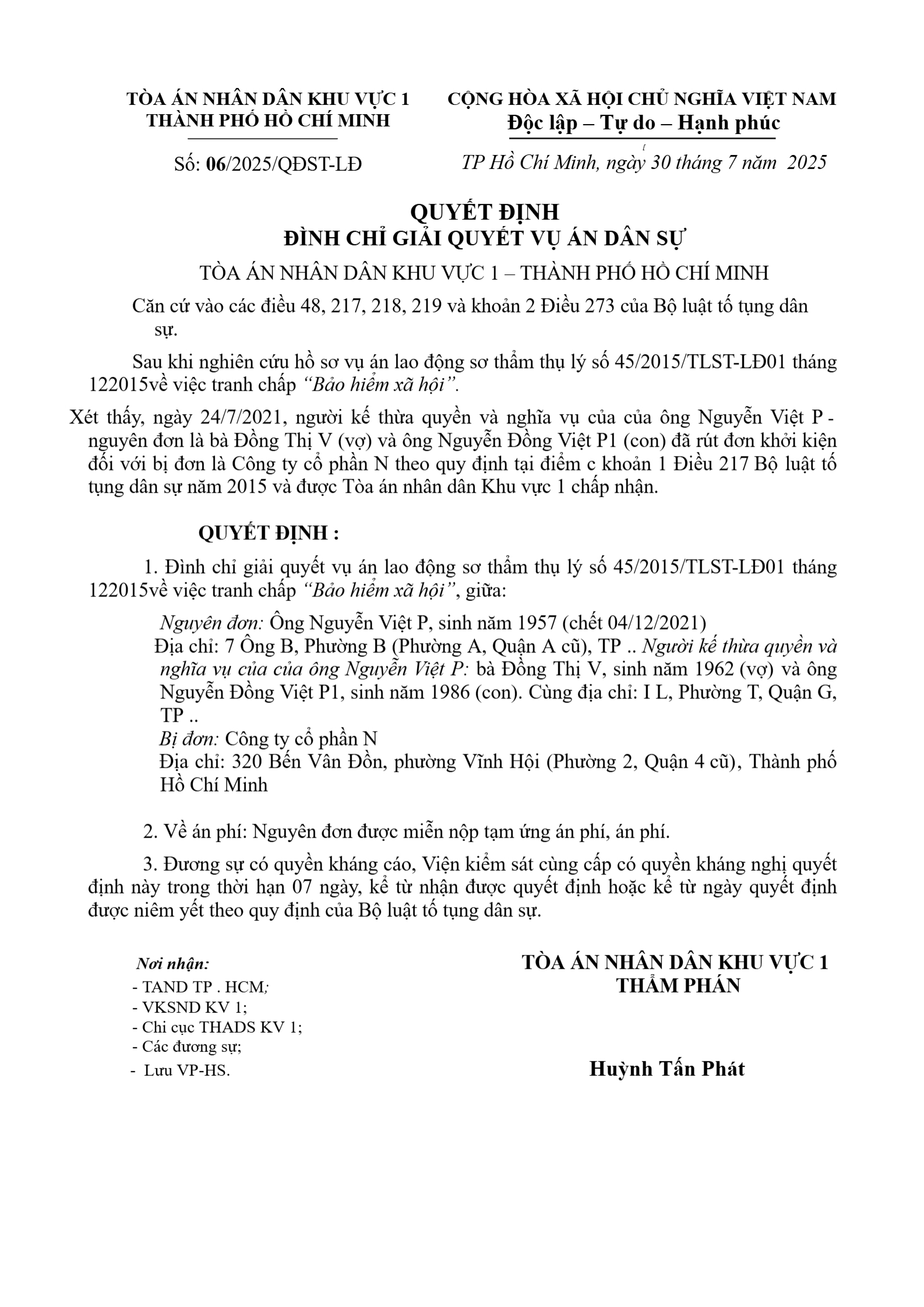 | Thông tin về vụ/việc: | QUYẾT ĐỊNH ĐÌNH CHỈ GIẢI QUYẾT VỤ ÁN DÂN SỰ tranh chấp “Bảo hiểm xã hội” |