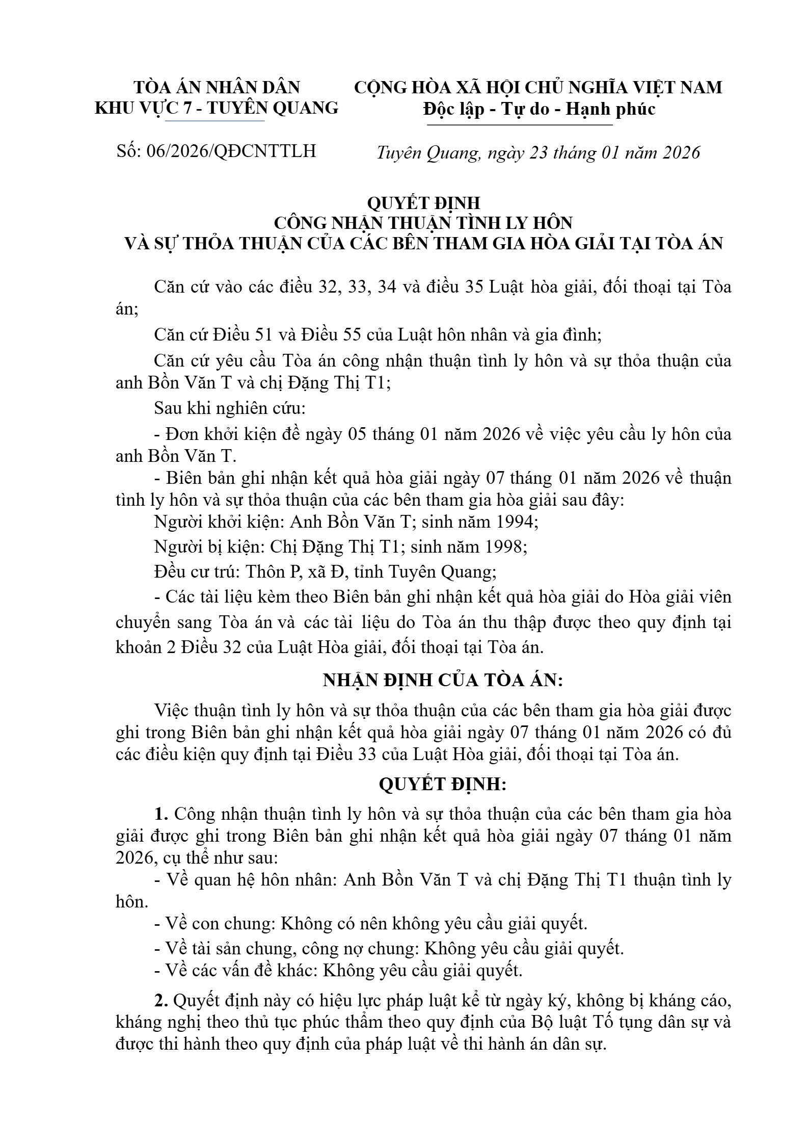 Quyết định số 06/2026/QĐCNTTLH ngày 23/01/2026 của Tòa án nhân dân khu vực 7 - Tuyên Quang, tỉnh Tuyên Quang về vụ án ly hôn về mâu thuẫn gia đình