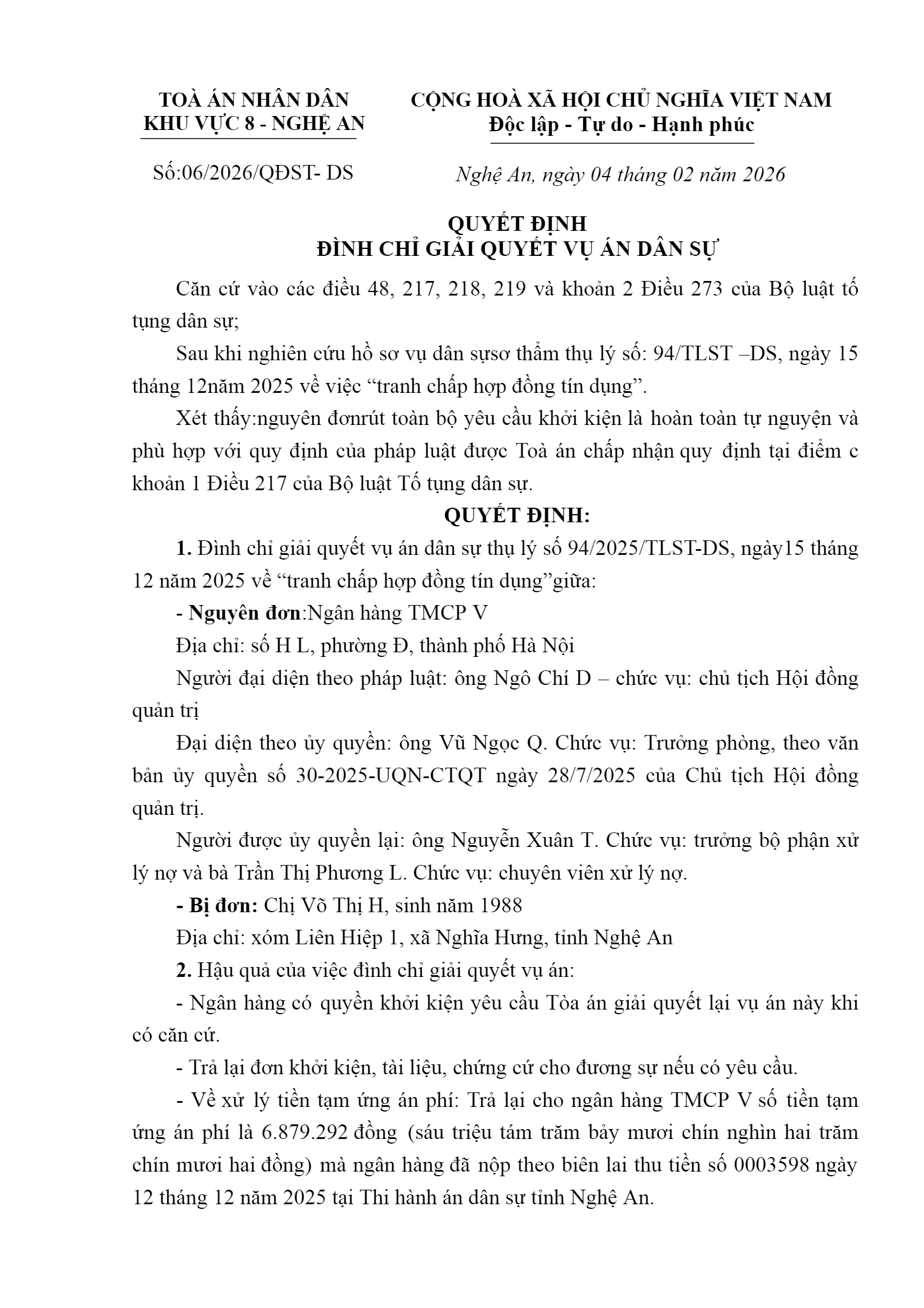Quyết định số 06/2026/QĐST-DS ngày 04/02/2026 của Tòa án nhân dân khu vực 8 - Nghệ An, tỉnh Nghệ An về tranh chấp hợp đồng tín dụng