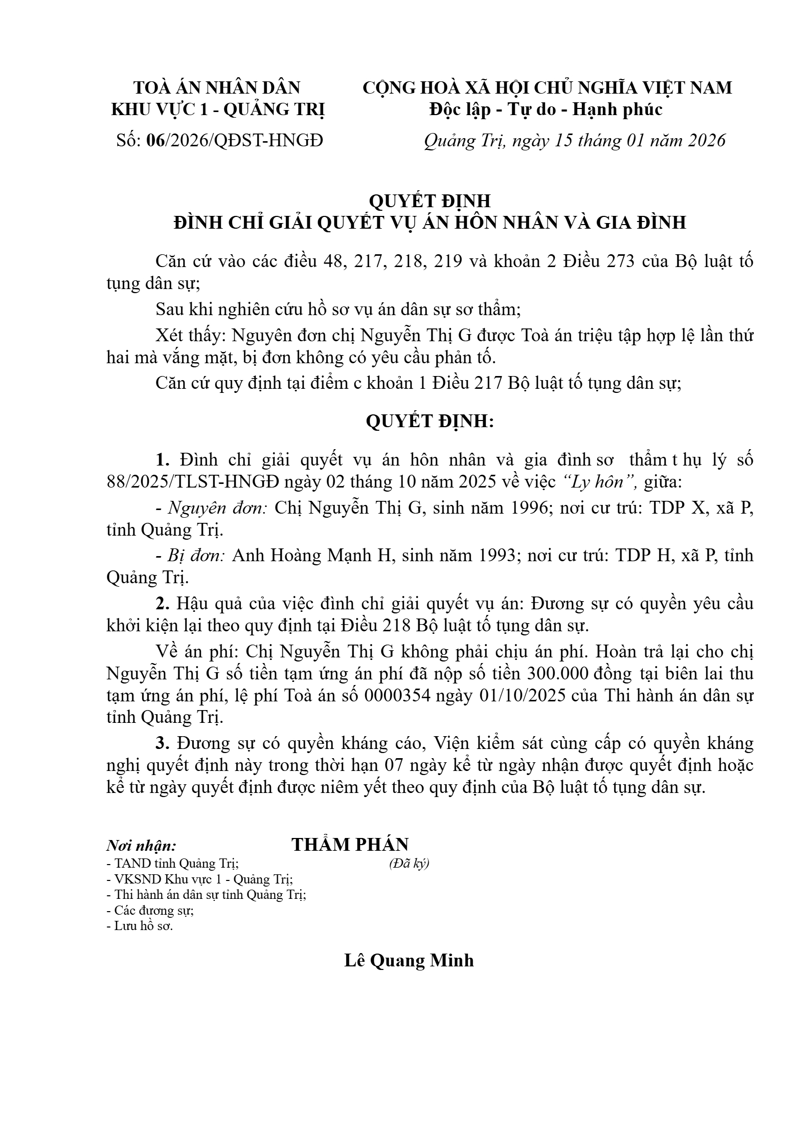 | Thông tin về vụ/việc: | QĐST-HNGĐ SỐ 06-2026 NGUYỄN THỊ G - HOÀNG MẠNH H |