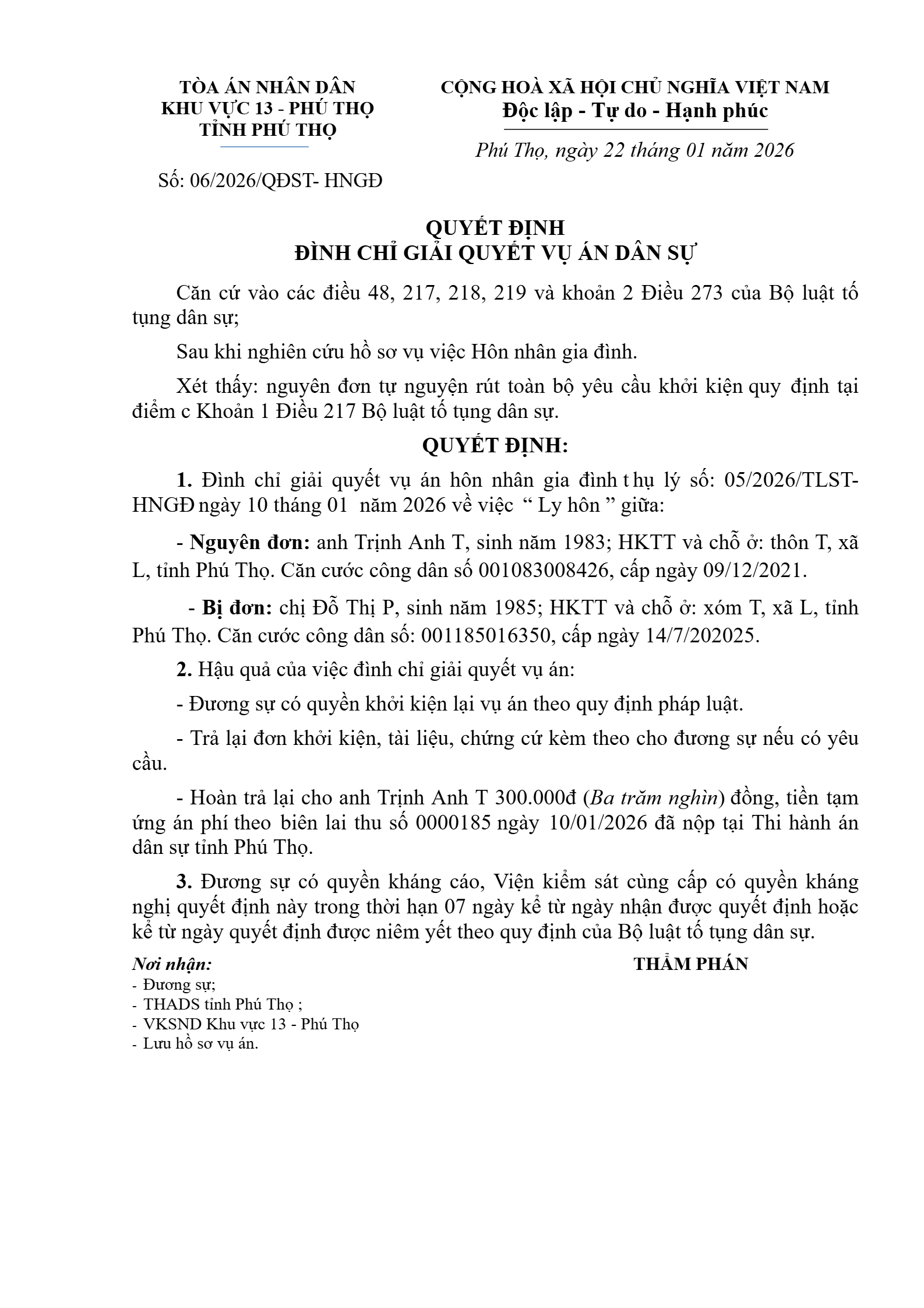 Quyết định số 06/2026/QĐST-HNGĐ ngày 22/01/2026 của Tòa án nhân dân khu vực 13 - Phú Thọ, tỉnh Phú Thọ về vụ án ly hôn về mâu thuẫn gia đình