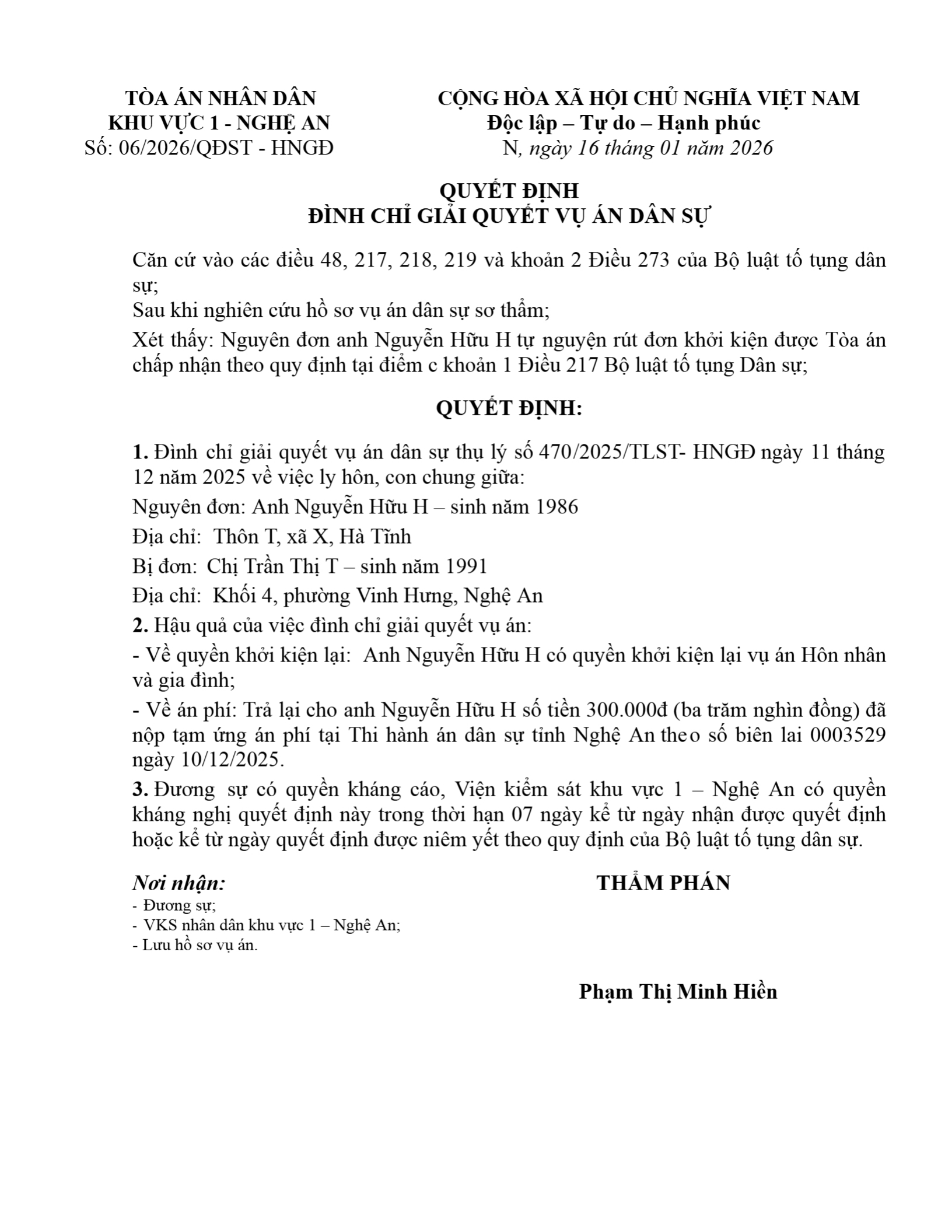 Quyết định số 06/2026/QĐST-HNGĐ ngày 16/01/2026 của Tòa án nhân dân khu vực 1 - Nghệ An, tỉnh Nghệ An về vụ án ly hôn về mâu thuẫn gia đình