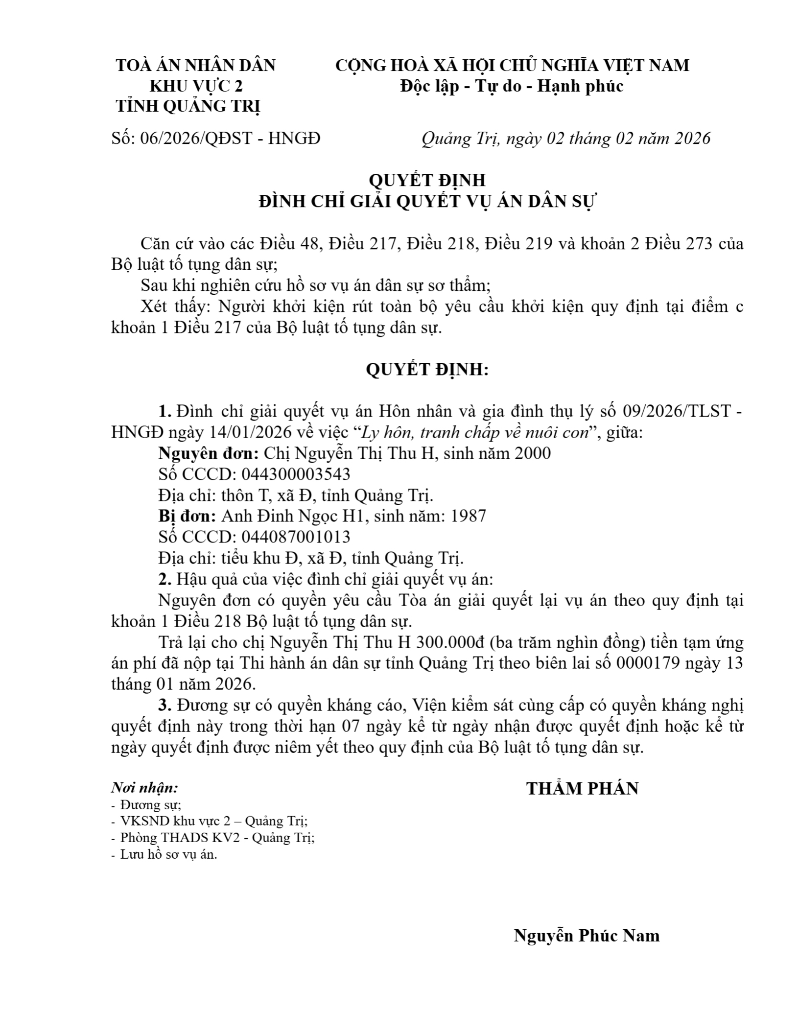Quyết định số 06/2026/QĐST-HNGĐ ngày 02/02/2026 của Tòa án nhân dân khu vực 2 - Quảng Trị, tỉnh Quảng Trị về vụ án ly hôn về mâu thuẫn gia đình