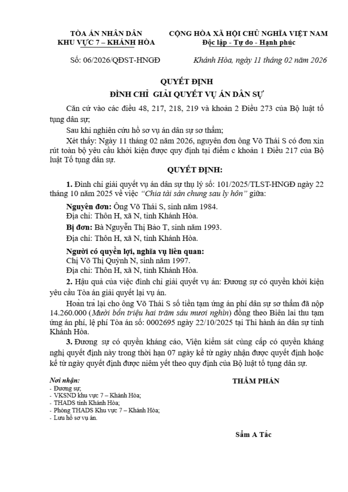 | Tên Quyết định: | Quyết định số 06/2026/QĐST-HNGĐ ngày 11/02/2026 của Tòa án nhân dân khu vực 7 - Khánh Hòa, tỉnh Khánh Hòa về tranh chấp về chia tài sản khi ly hôn |
