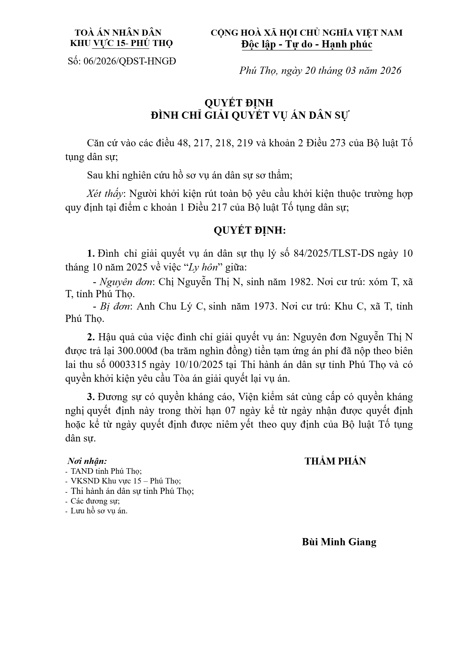 | Thông tin về vụ/việc: | Đình chỉ giải quyết vụ án dân sự thụ lý số 84/2025/TLST-DS ngày 10 tháng 10 năm 2025 về việc “Ly hôn” |