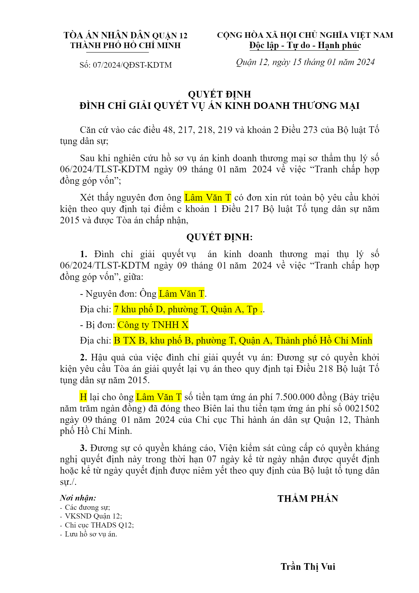 Quyết định số 07/2024/QĐST-KDTM ngày 15/01/2024 của TAND Quận 12, TP. Hồ Chí Minh về tranh chấp giữa người chưa phải là thành viên công ty nhưng có giao dịch về chuyển nhượng phần vốn góp với công ty, thành viên công ty