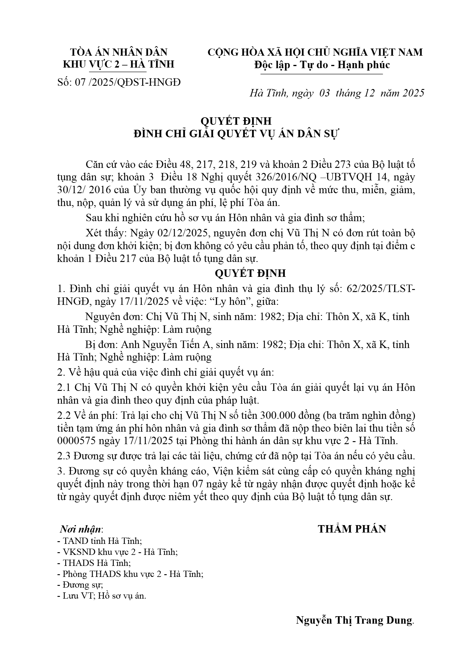 | Thông tin về vụ/việc: | Đình chỉ HNGĐ Vũ Thị N - Nguyễn Tiến A |