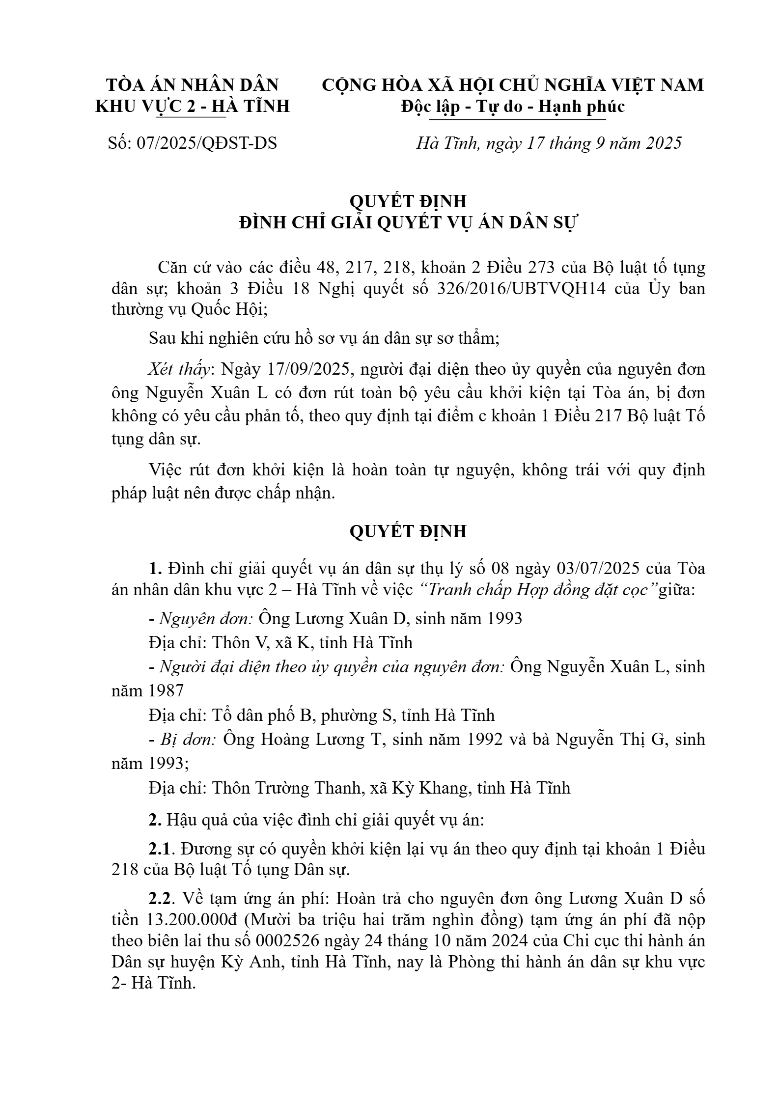 Quyết định số 07/2025/QĐST-DS ngày 17/09/2025 của Tòa án nhân dân khu vực 2 - Hà Tĩnh, tỉnh Hà Tĩnh về tranh chấp hợp đồng đặt cọc