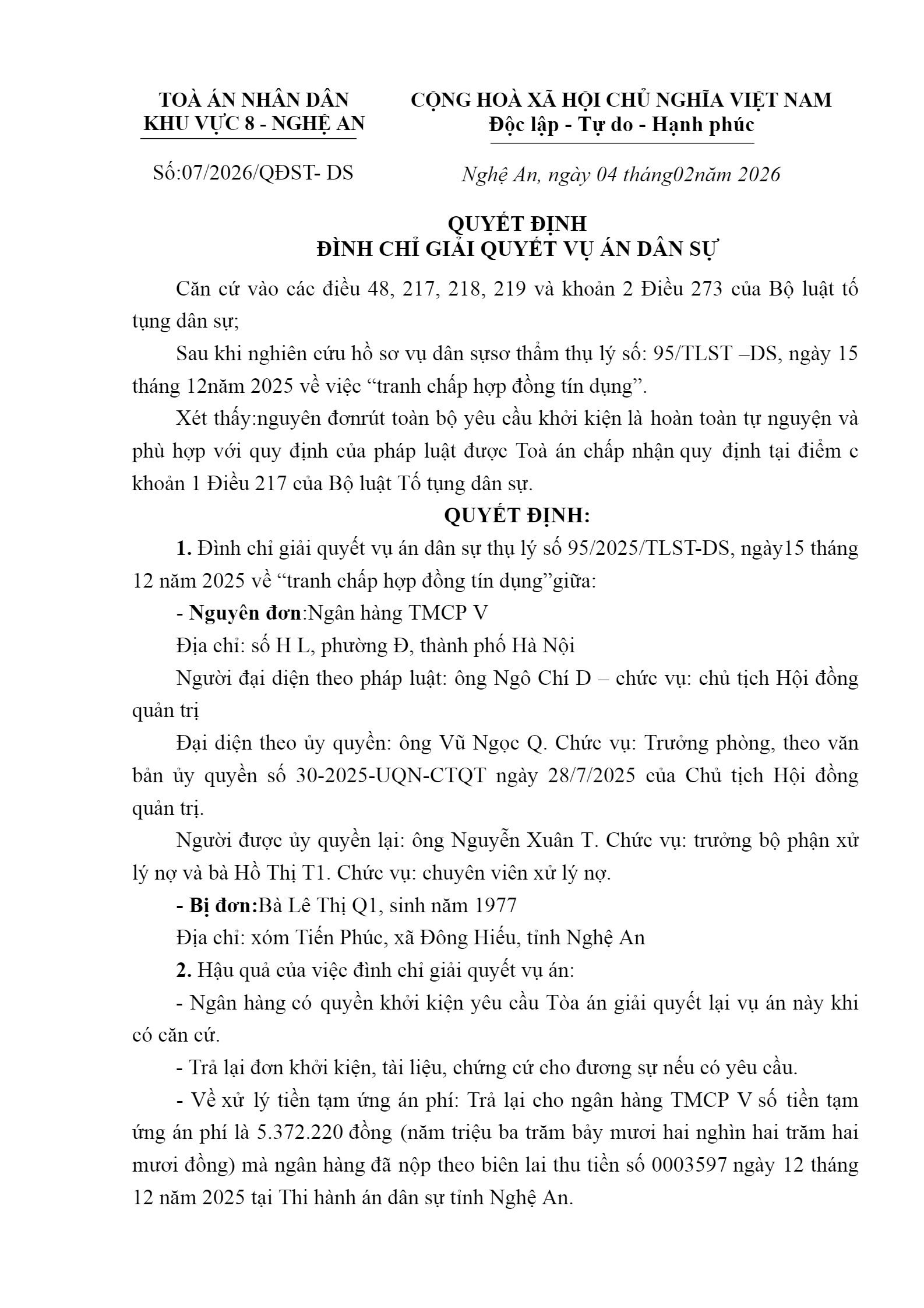 Quyết định số 07/2026/QĐST-DS ngày 04/02/2026 của Tòa án nhân dân khu vực 8 - Nghệ An, tỉnh Nghệ An về tranh chấp hợp đồng tín dụng