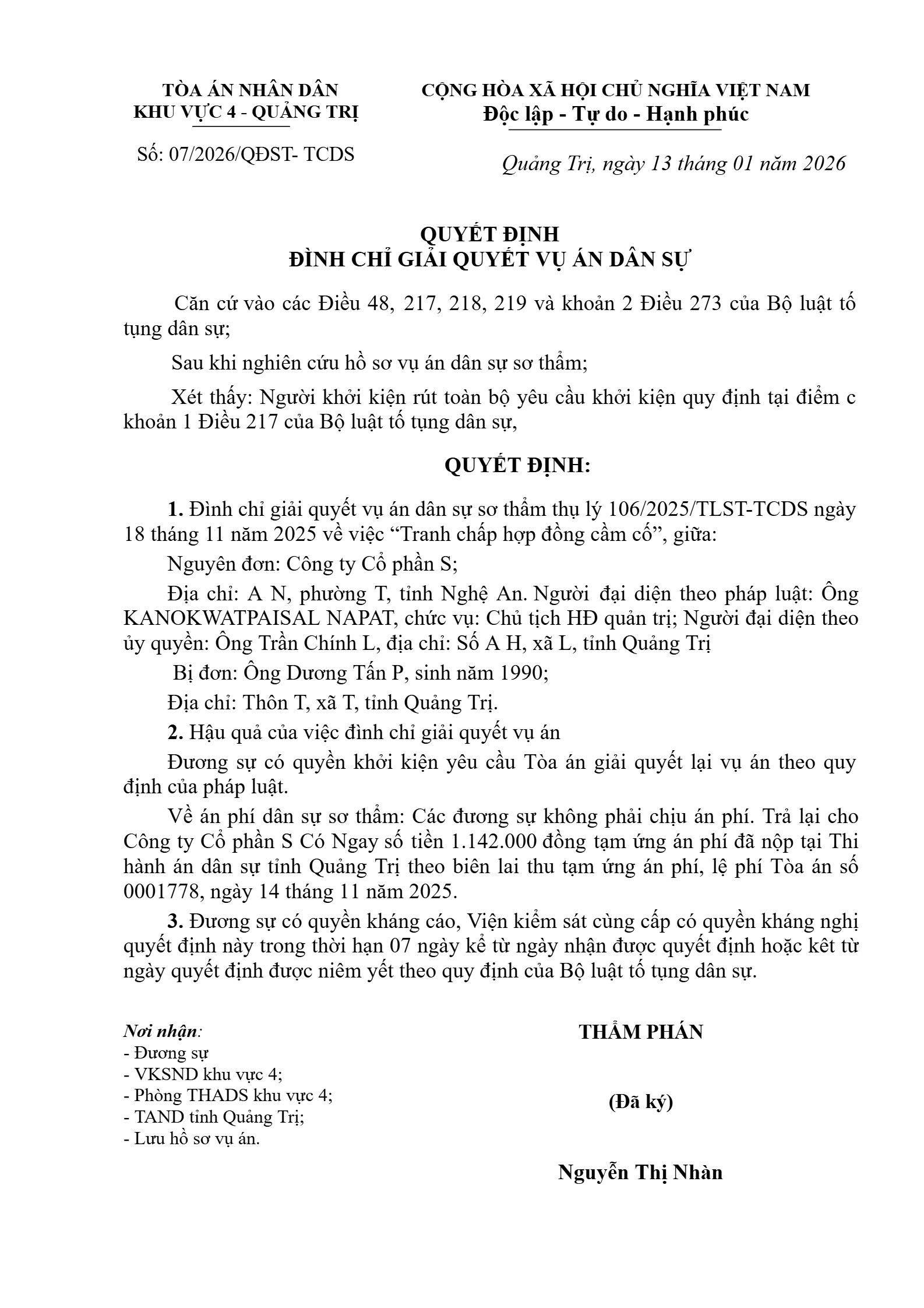 Quyết định số 07/2026/QĐST-TCDS ngày 13/01/2026 của Tòa án nhân dân khu vực 4 - Quảng Trị, tỉnh Quảng Trị về tranh chấp hợp đồng vay tài sản