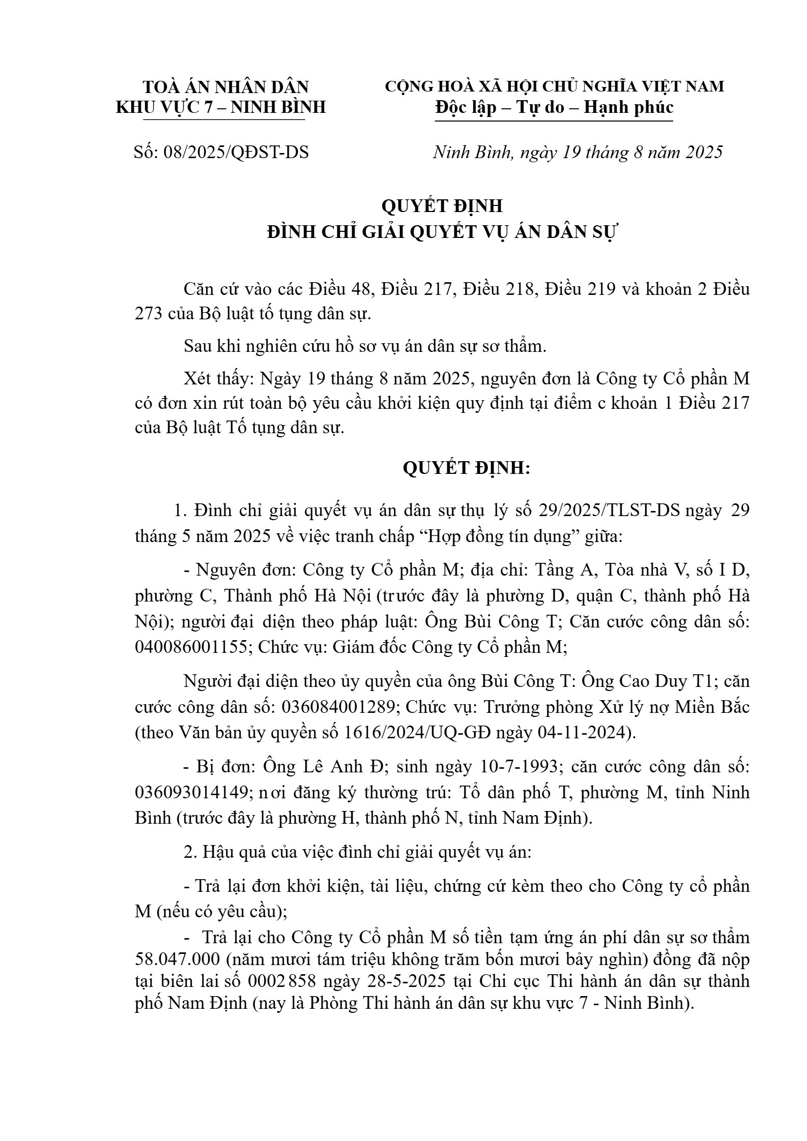 Quyết định số 08/2025/QĐST-DS ngày 19/08/2025 của Tòa án nhân dân khu vực 7 - Ninh Bình, tỉnh Ninh Bình về tranh chấp giữa cá nhân với cá nhân về quốc tịch việt nam