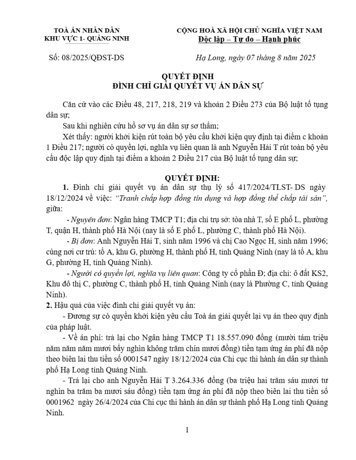 Quyết định số 08/2025/QĐST-DS ngày 07/08/2025 của Tòa án nhân dân khu vực 1 - Quảng Ninh, tỉnh Quảng Ninh về tranh chấp hợp đồng tín dụng