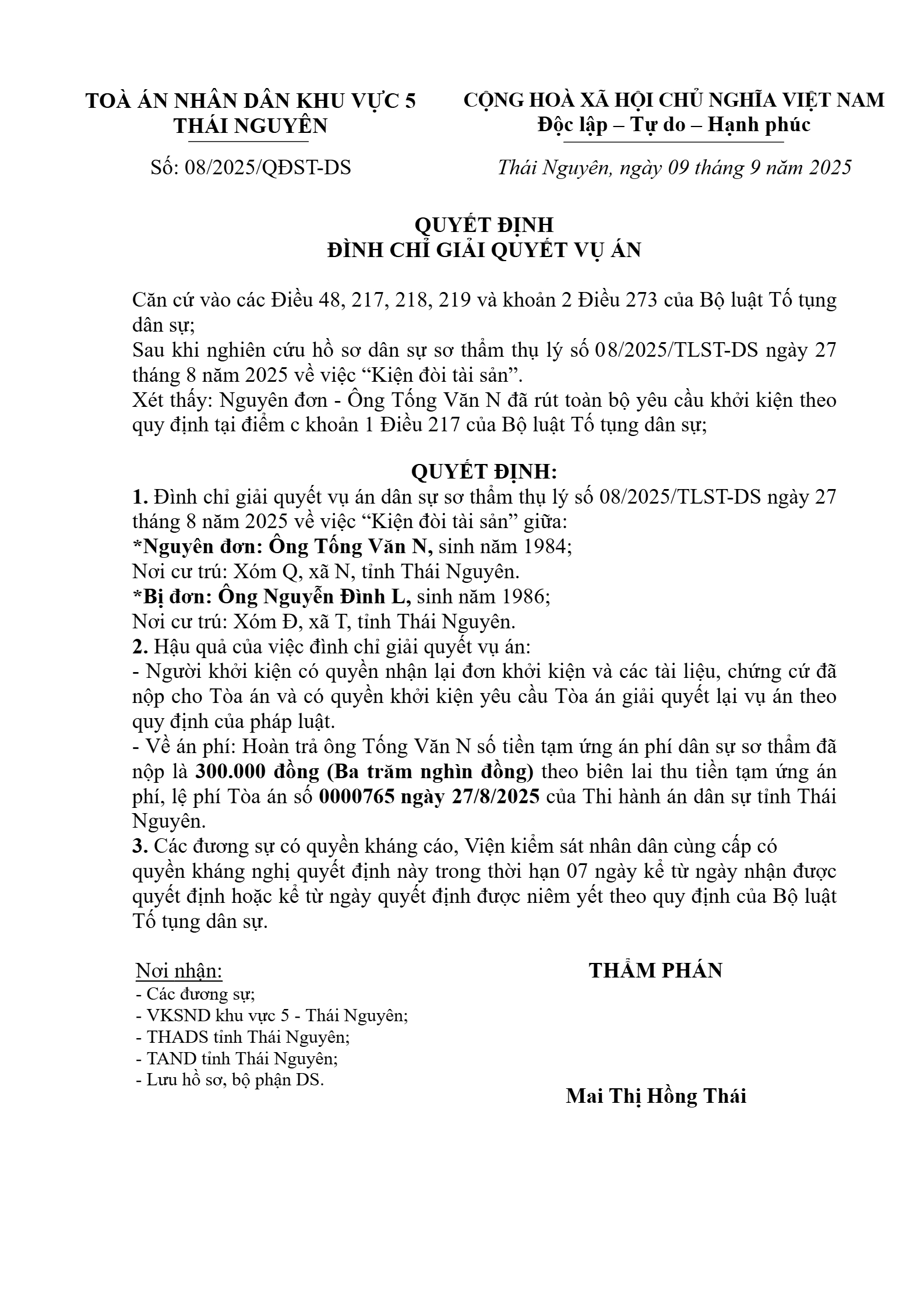 Quyết định số 08/2025/QĐST-DS ngày 09/09/2025 của Tòa án nhân dân khu vực 5 - Thái Nguyên, tỉnh Thái Nguyên về tranh chấp hợp đồng vay tài sản
