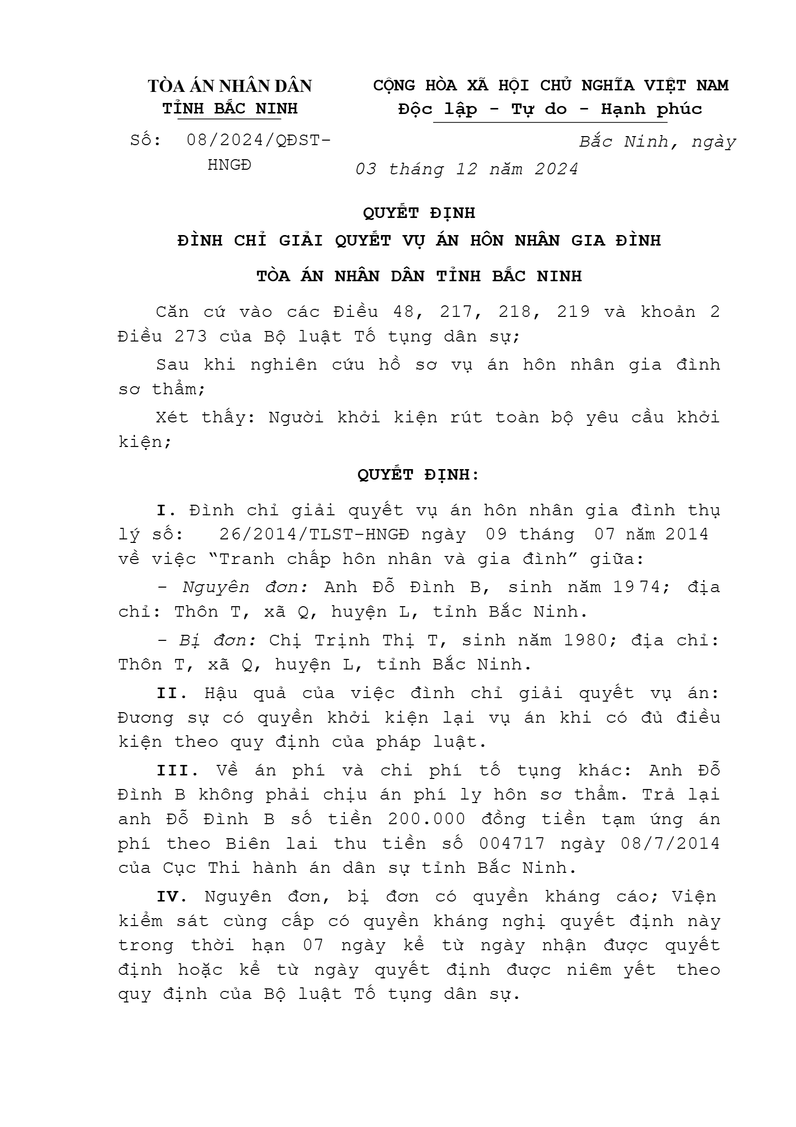 Quyết định số 08/2025/QĐST-HNGĐ ngày 03/12/2025 của TAND tỉnh Bắc Ninh về vụ án ly hôn về mâu thuẫn gia đình