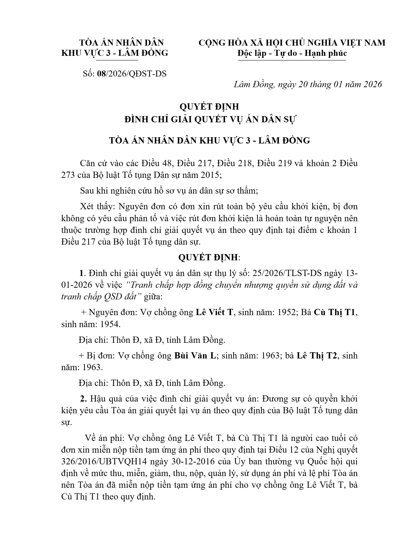 Quyết định số 08/2026/QĐST-DS ngày 20/01/2026 của Tòa án nhân dân khu vực 3 - Lâm Đồng, tỉnh Lâm Đồng về tranh chấp quyền sử dụng đất