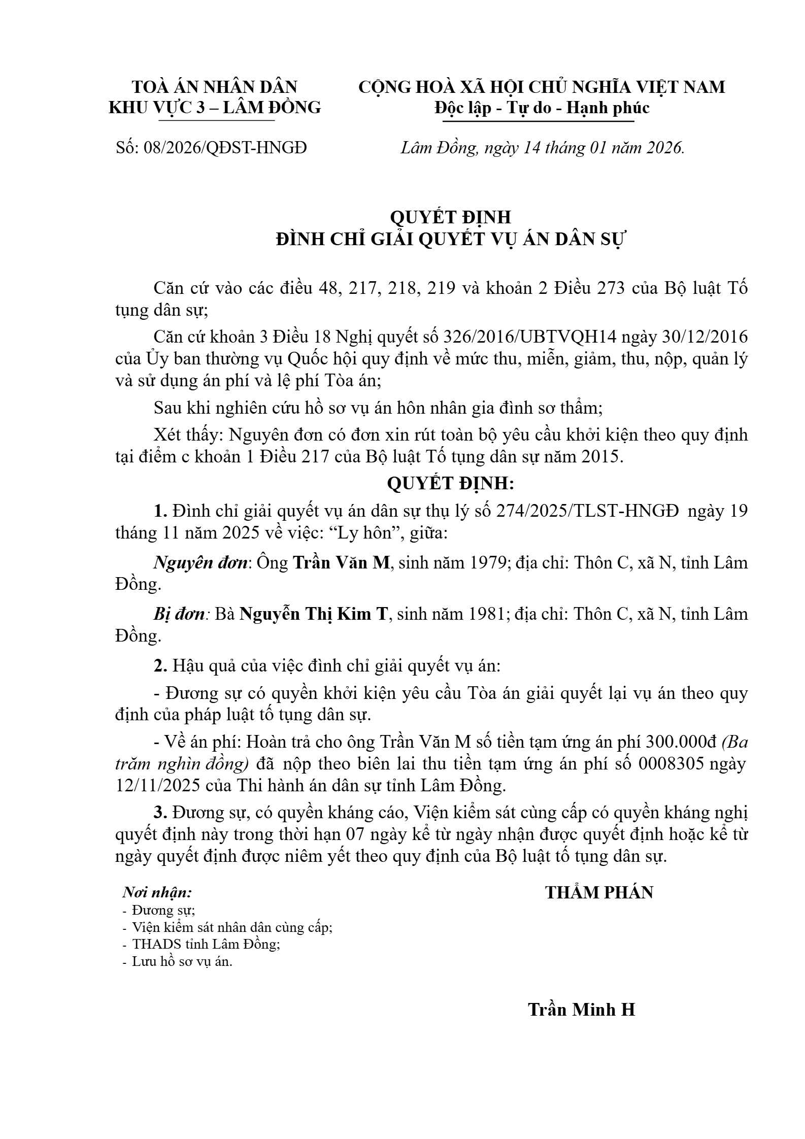 Quyết định số 08/2026/QĐST-HNGĐ ngày 14/01/2026 của Tòa án nhân dân khu vực 3 - Lâm Đồng, tỉnh Lâm Đồng về vụ án ly hôn về mâu thuẫn gia đình