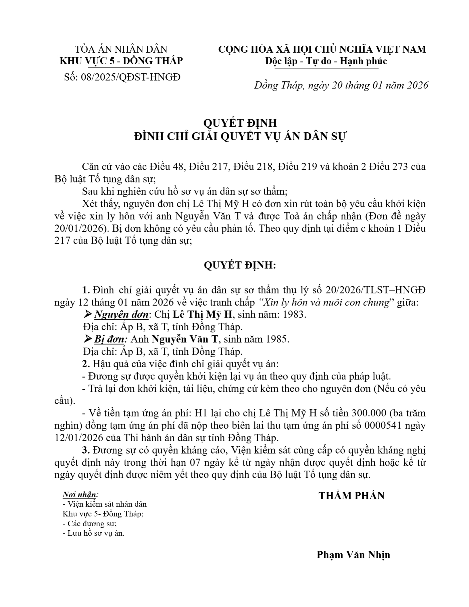 | Tòa án xét xử: | Tòa án nhân dân khu vực 5 - Đồng Tháp, tỉnh Đồng Tháp |