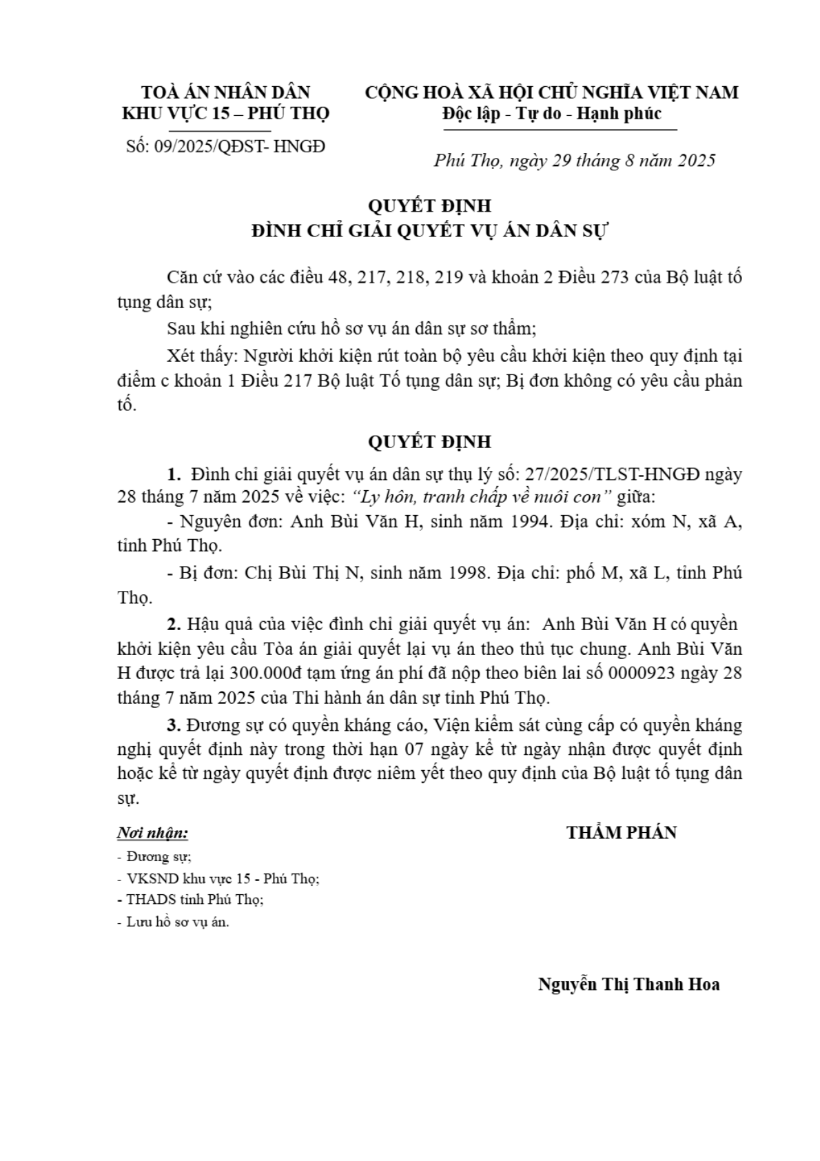 Quyết định số 09/2025/QĐST- ngày 30/09/2025 của Tòa án nhân dân khu vực 15 - Phú Thọ, tỉnh Phú Thọ về vụ án ly hôn về mâu thuẫn gia đình