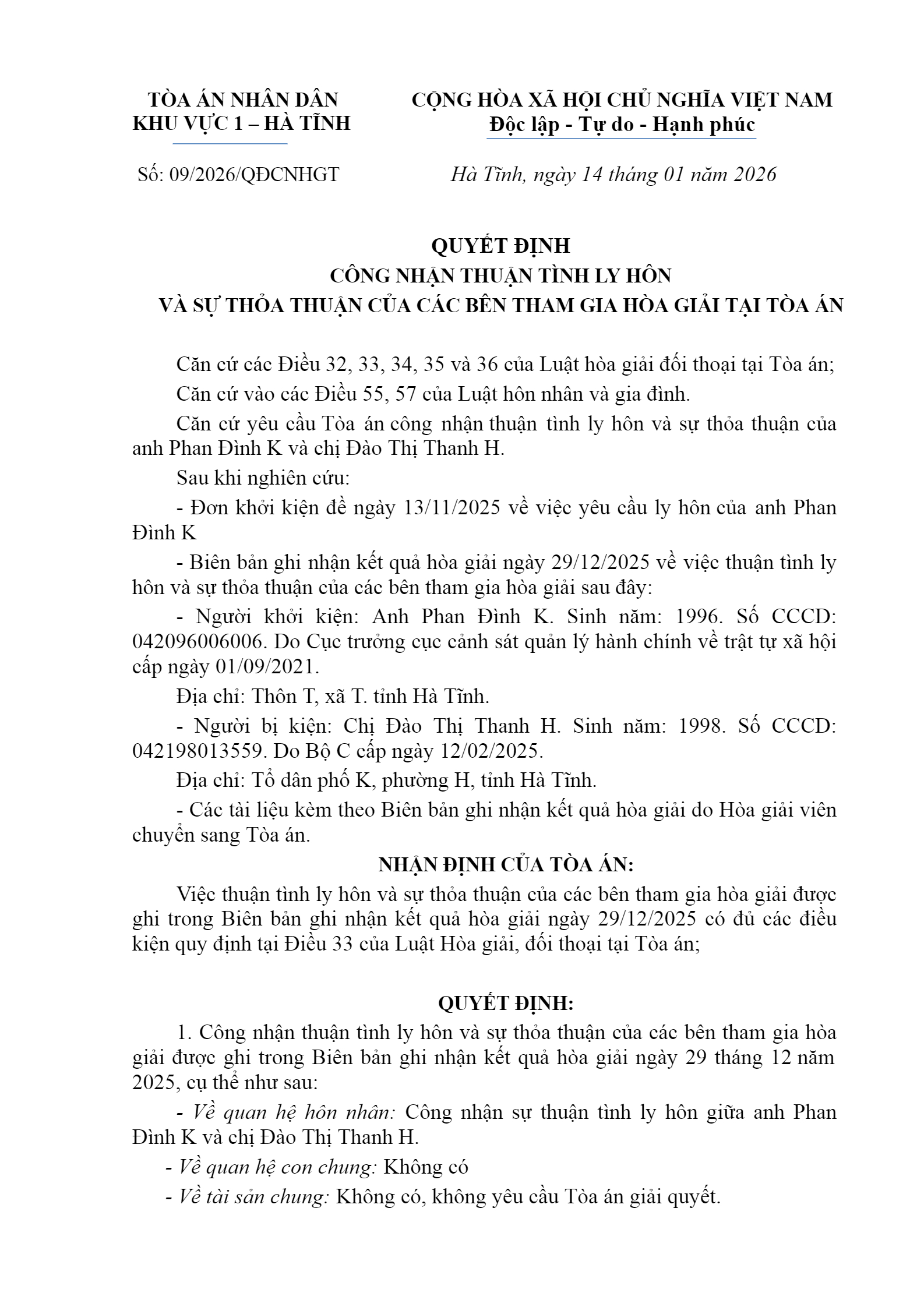 Quyết định số 09/2026/QĐCNHGT ngày 14/01/2026 của Tòa án nhân dân khu vực 1 - Hà Tĩnh, tỉnh Hà Tĩnh về vụ án ly hôn về mâu thuẫn gia đình