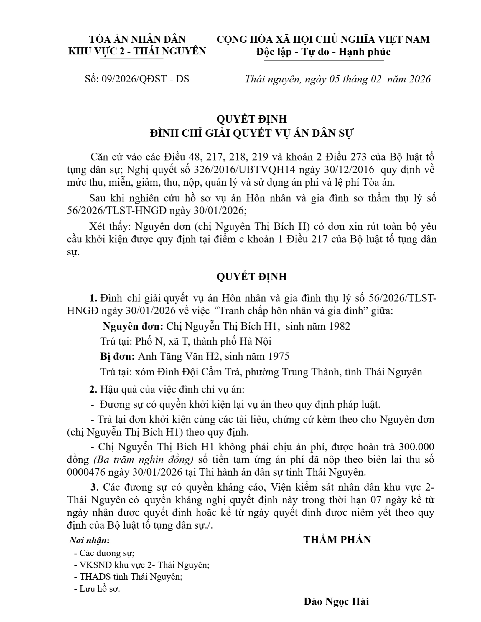 Quyết định số 09/2026/QĐST ngày 05/02/2026 của Tòa án nhân dân khu vực 2 - Thái Nguyên, tỉnh Thái Nguyên về vụ án ly hôn về mâu thuẫn gia đình