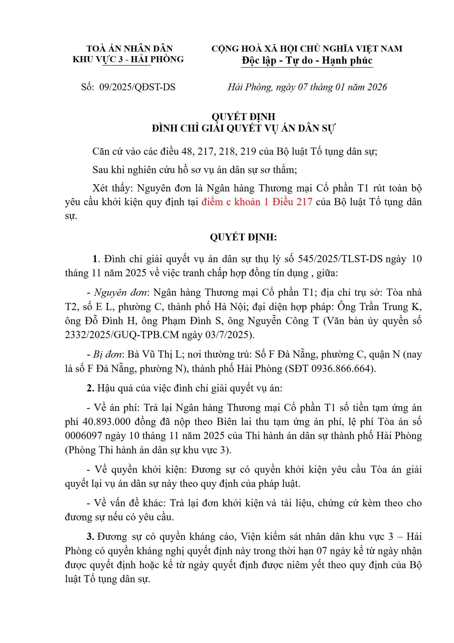 Quyết định số 09/2026/QĐST-DS ngày 07/01/2026 của Tòa án nhân dân khu vực 3 - Hải Phòng, TP. Hải Phòng về tranh chấp hợp đồng tín dụng