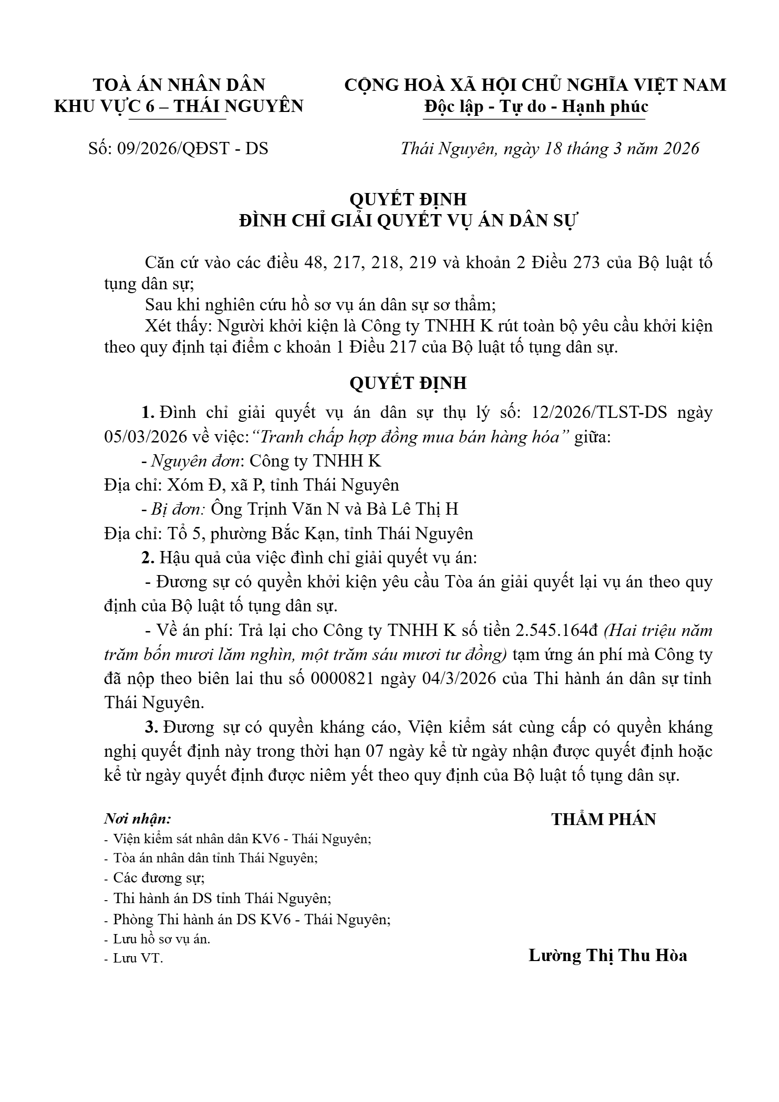 Quyết định số 09/2026/QĐST-DS ngày 18/03/2026 của Tòa án nhân dân khu vực 6 - Thái Nguyên, tỉnh Thái Nguyên về tranh chấp hợp đồng trao đổi tài sản
