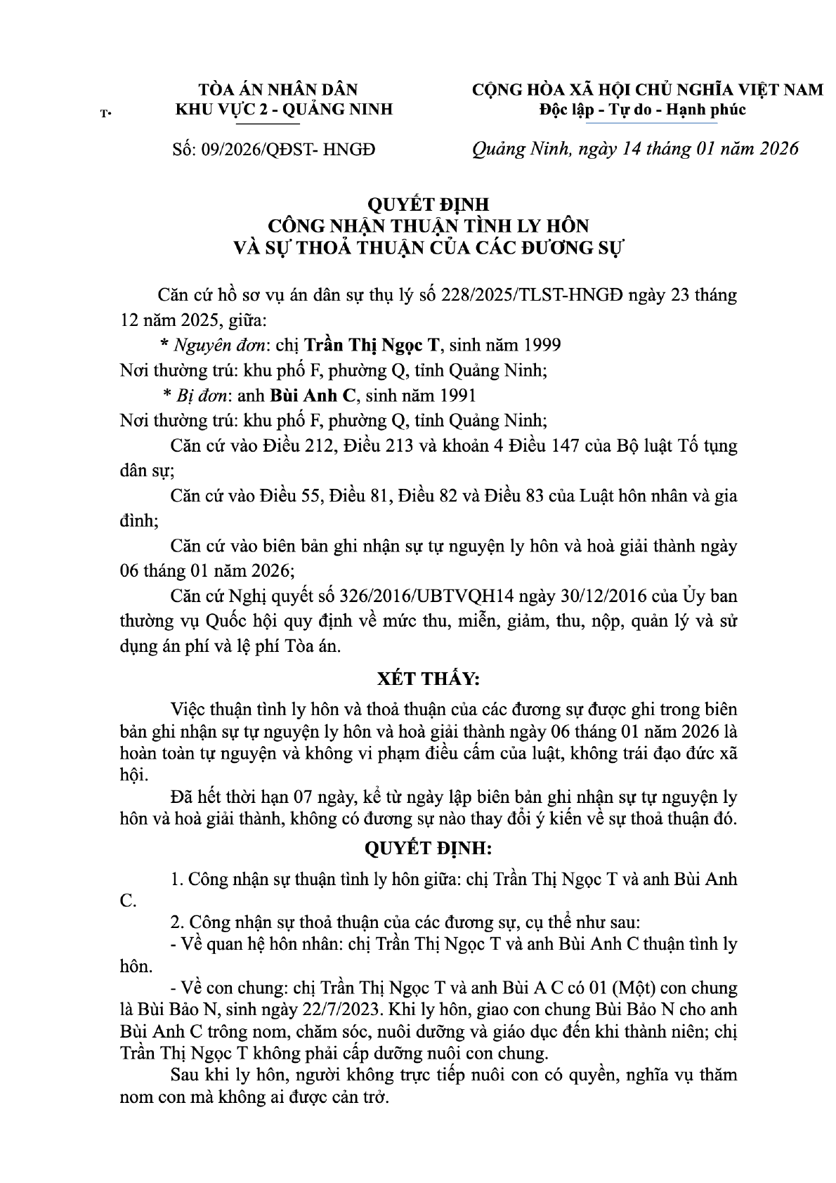 Quyết định số 09/2026/QĐST-HNGĐ ngày 14/01/2026 của Tòa án nhân dân khu vực 2 - Quảng Ninh, tỉnh Quảng Ninh về vụ án ly hôn về mâu thuẫn gia đình